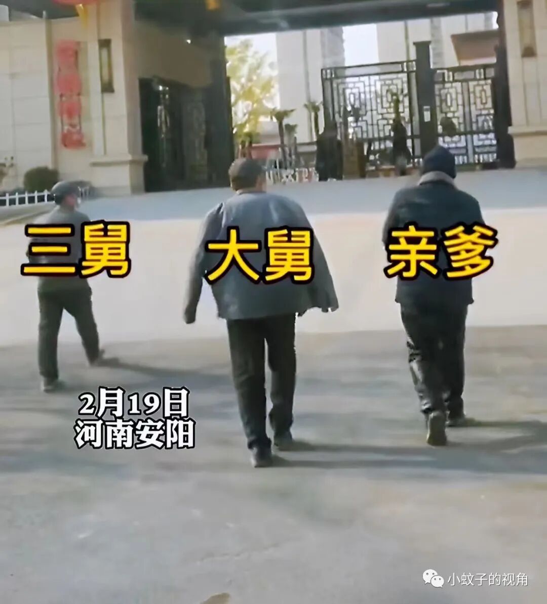 于是,这一幕就出现在男子的镜头下,三位衣着朴素的老人,步履蹒跚地向着小区的大门走去。