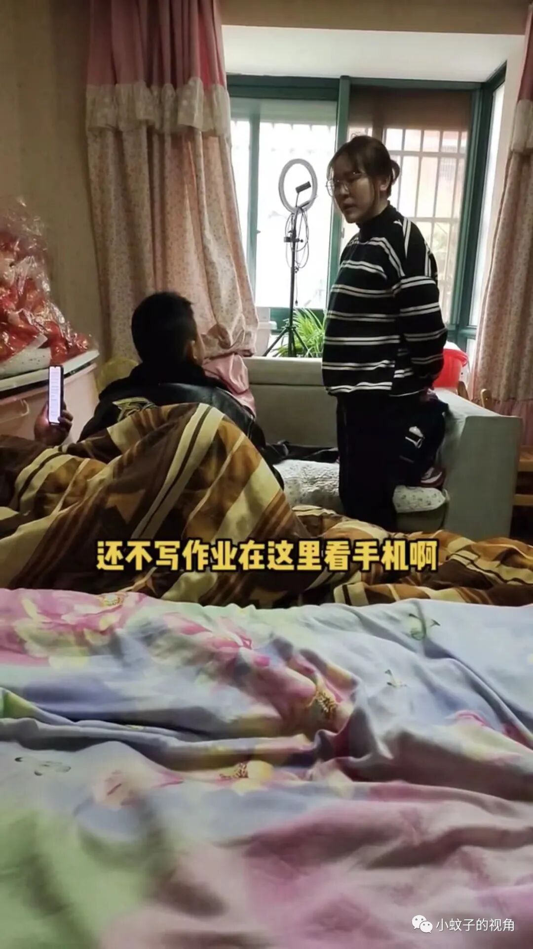女子说:“这么晚了,都十点多了,你不写作业还看手机呀?”