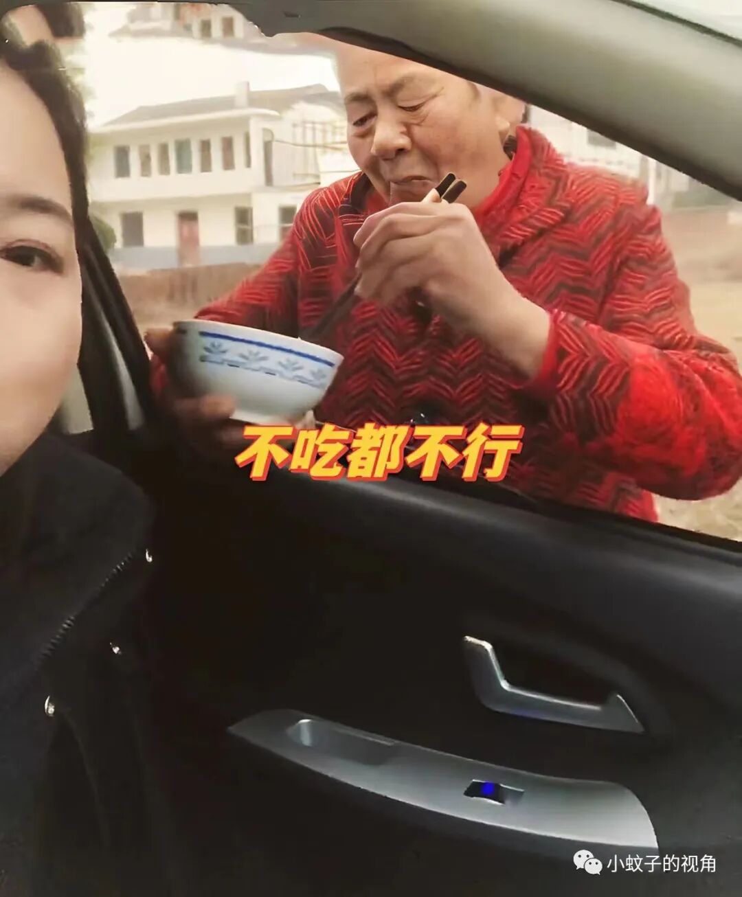 女子无奈之下选择逃跑,没想到坐在车上的她依然没能逃过奶奶的追喂,只见奶奶端着饭碗就追了出来:不吃饭怎么行?来,我喂你,吃了这碗丸子。