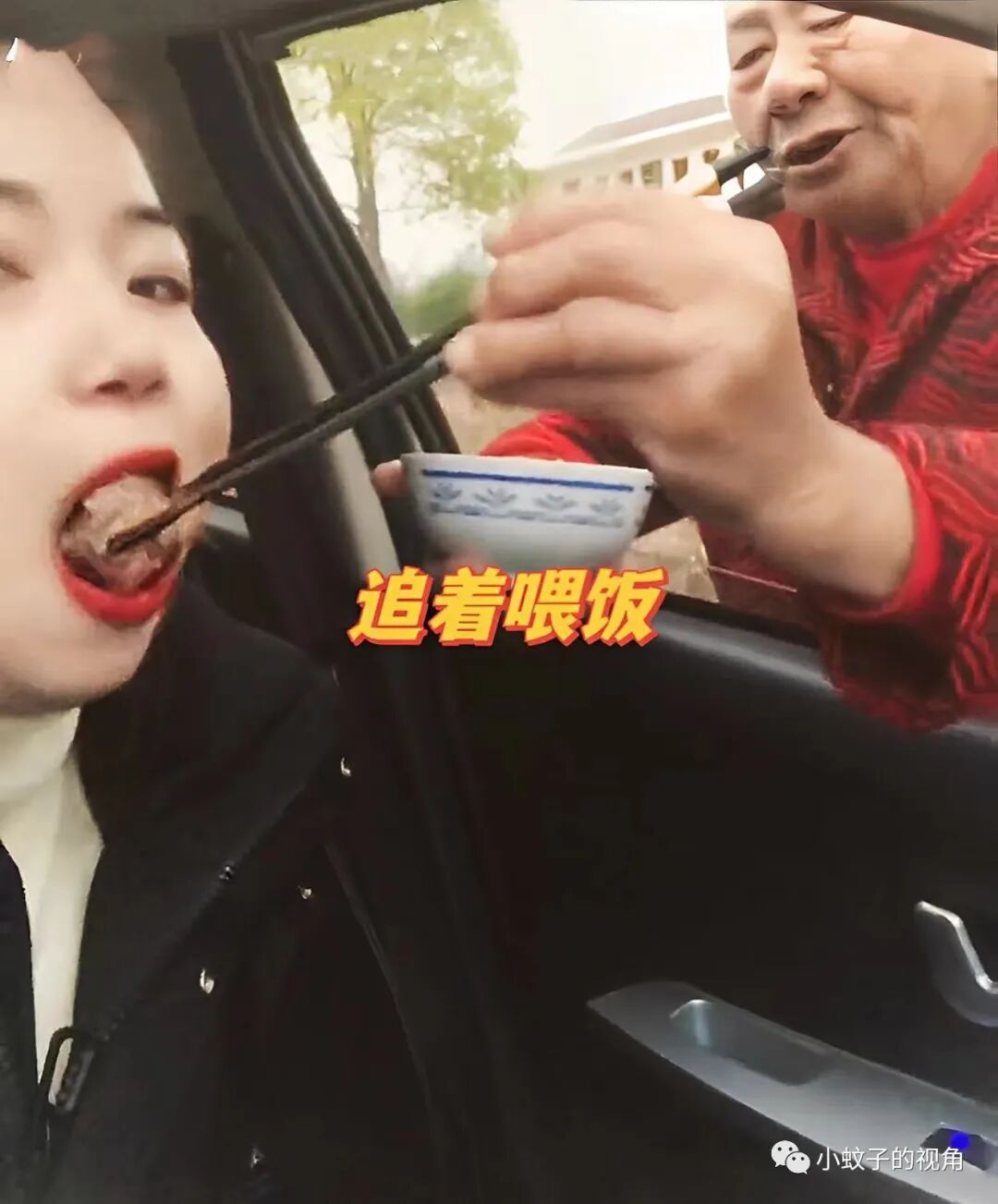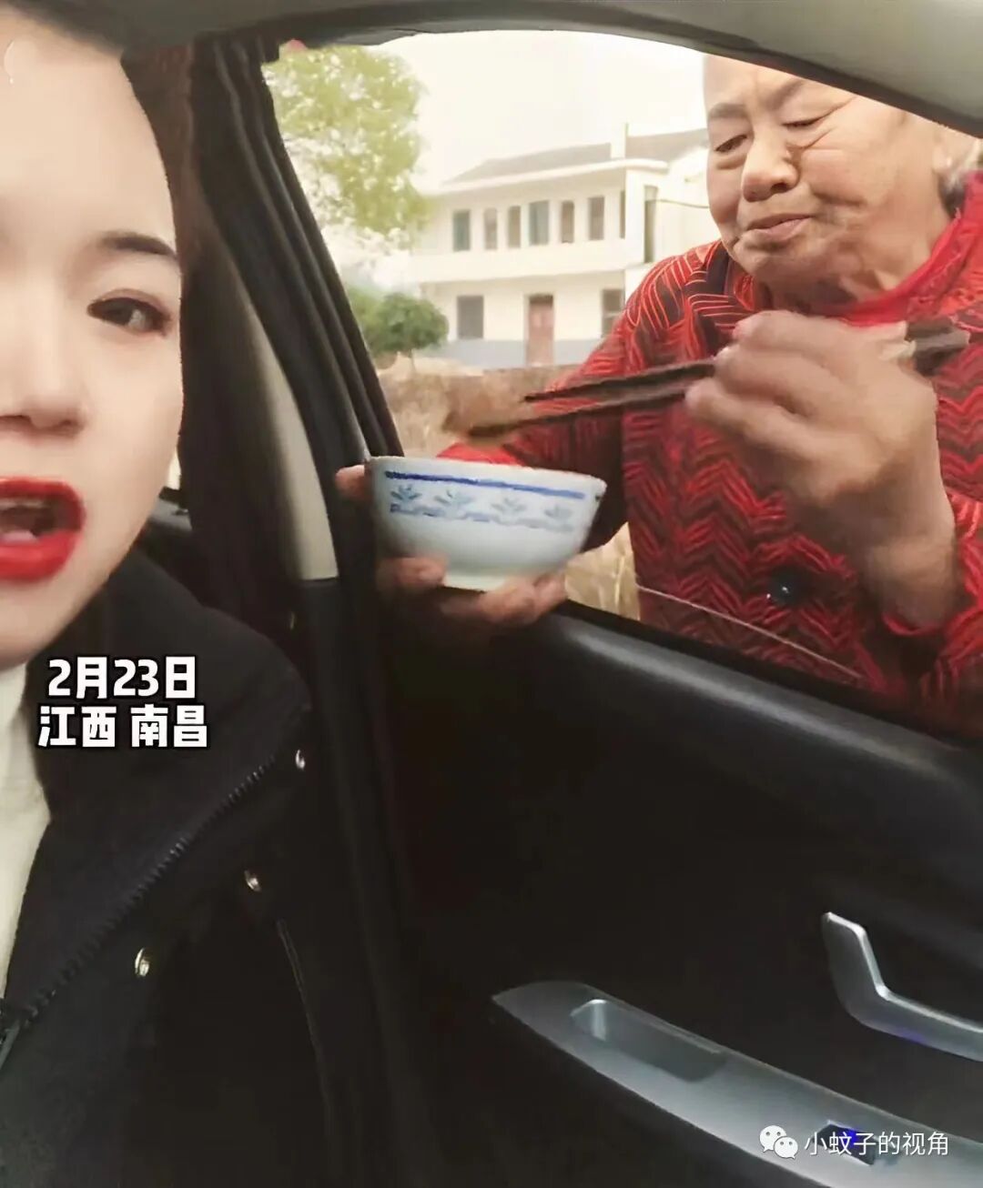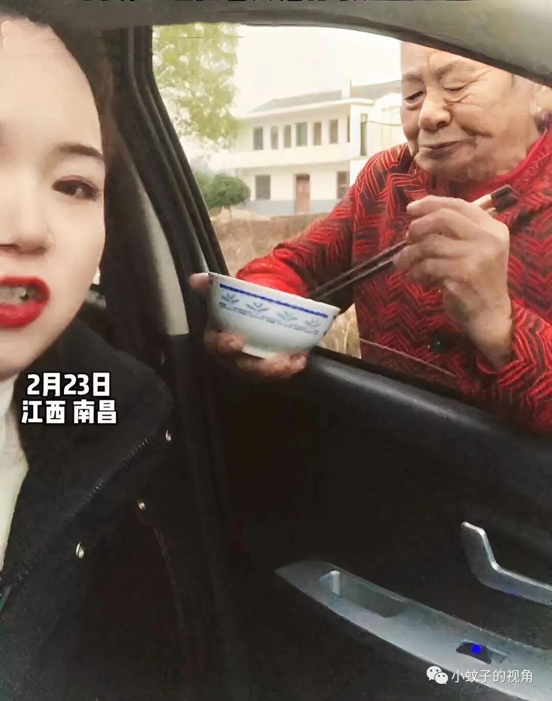 于是就出现这一幕,女子坐在车子上,奶奶隔着车窗一口一口给孙女喂饭,就像小时候一样。