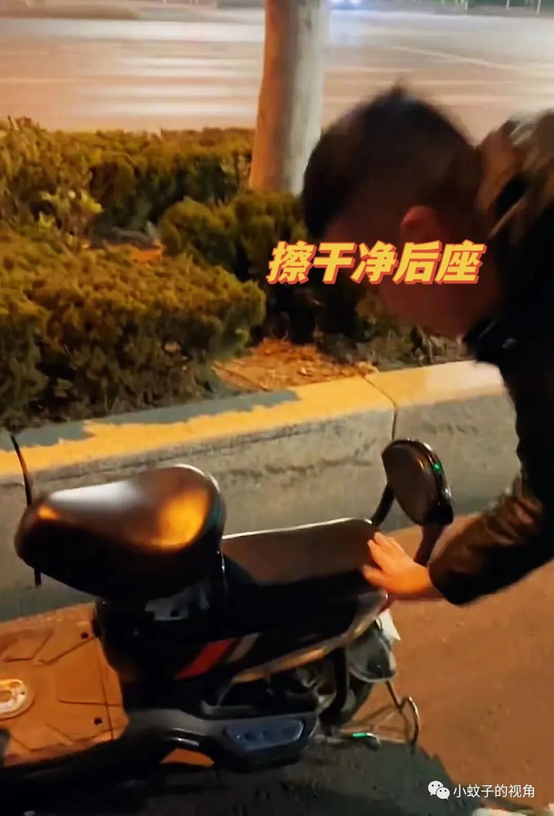 在妻子穿衣服的时候,他还细心地帮忙擦了擦电动车的后座,防止后座上的尘土弄脏了妻子的衣服。