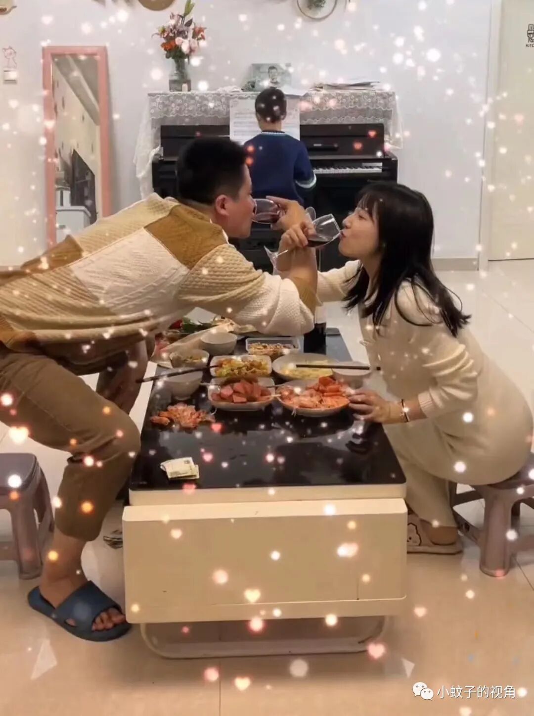 人家夫妻却丝毫都不介意。男子边说边半立起身体,举过酒杯,妻子也非常配合,身体前倾跟他喝交杯酒。