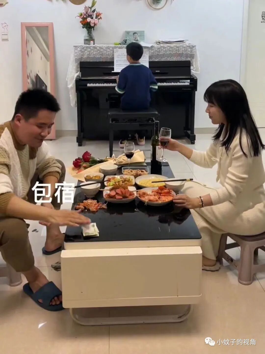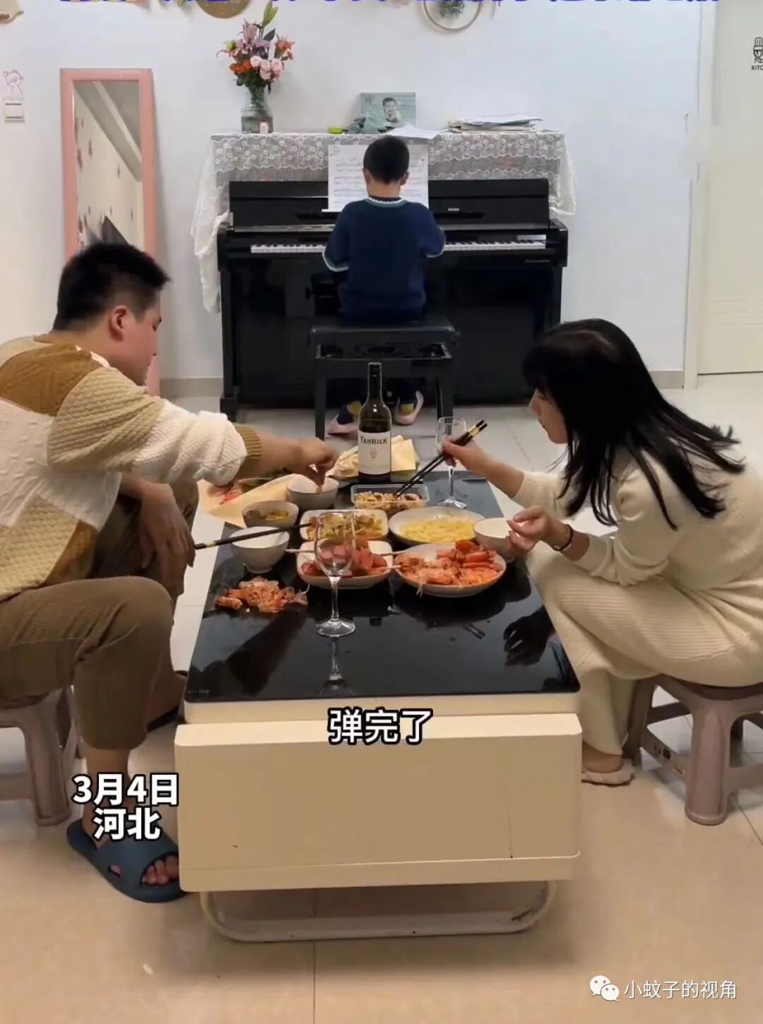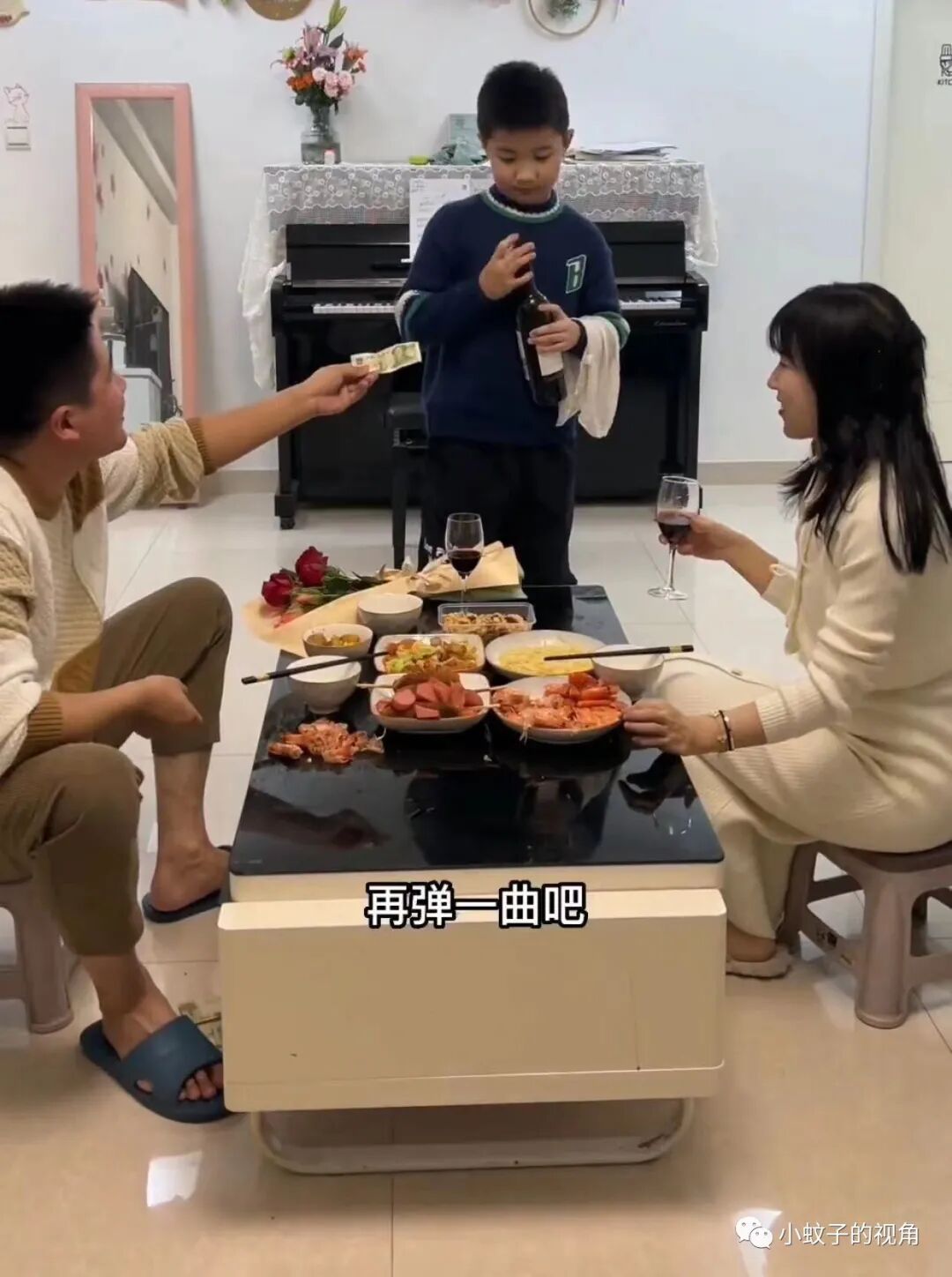 儿子笑眯眯地接过一块钱,坐在钢琴前继续弹奏,夫妻俩则端起酒杯:“来,干杯干杯。”