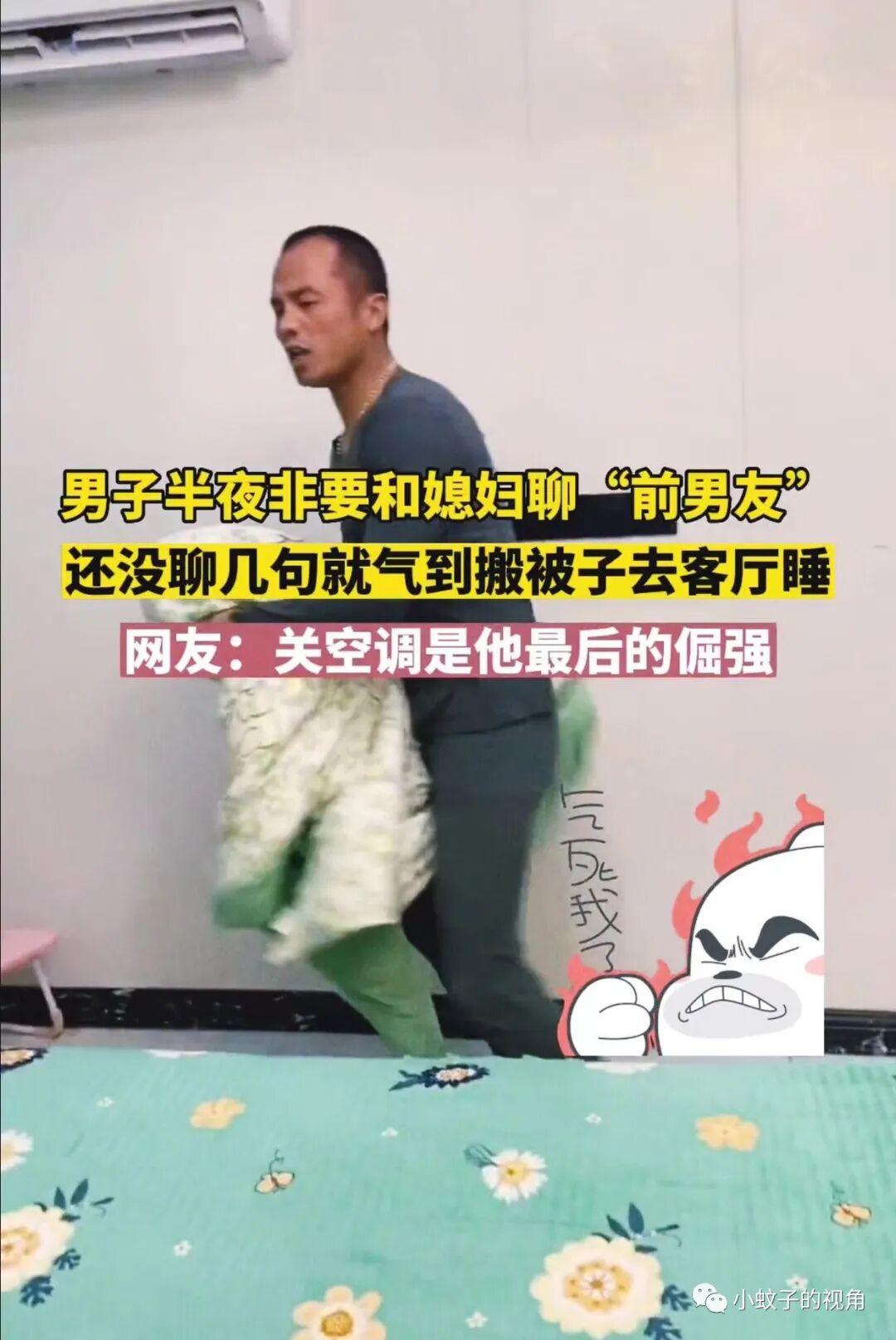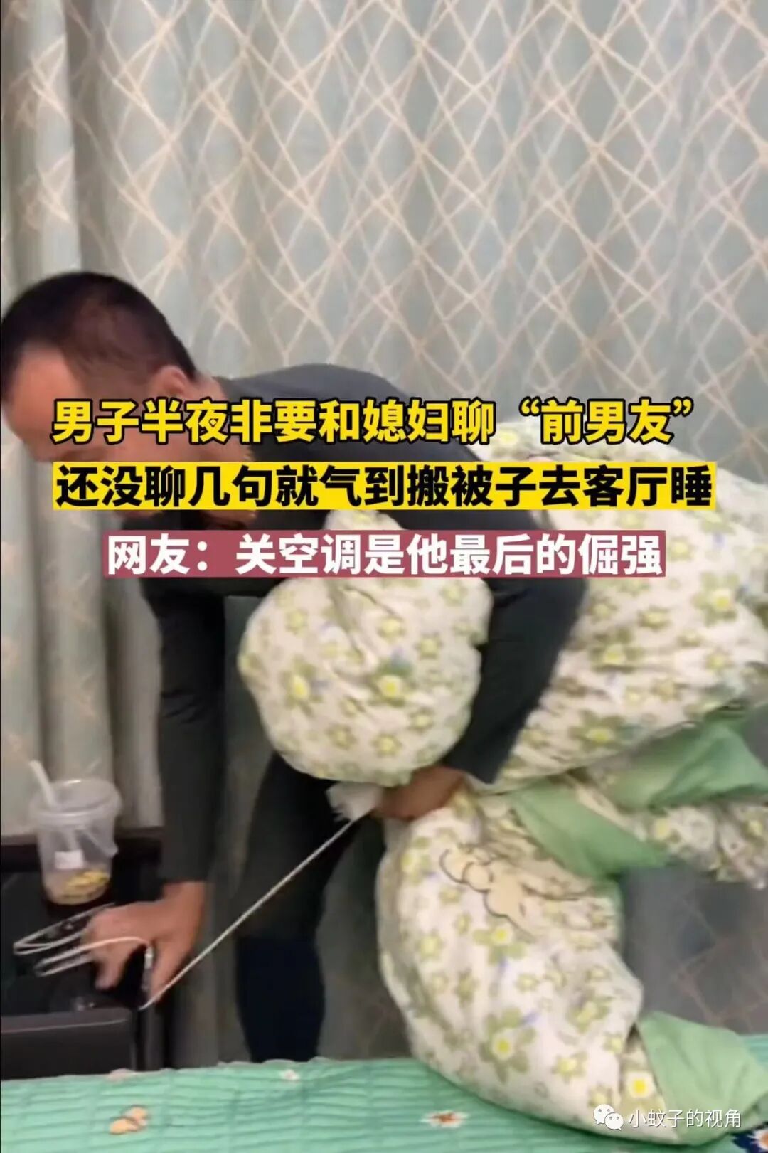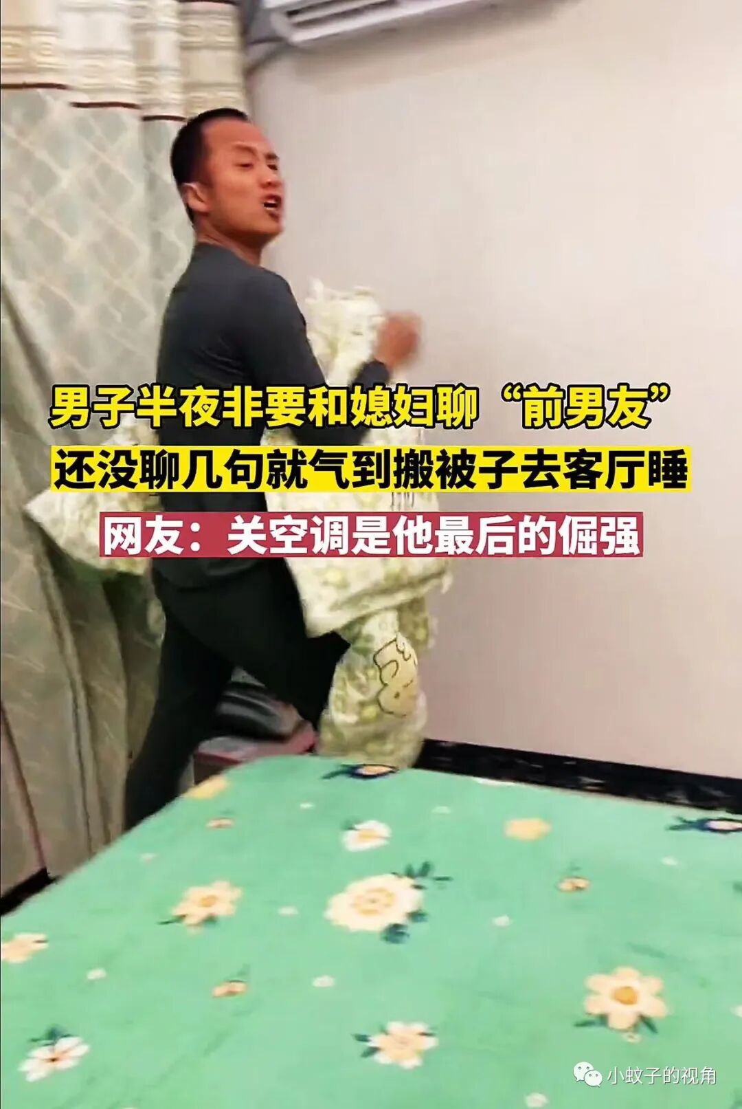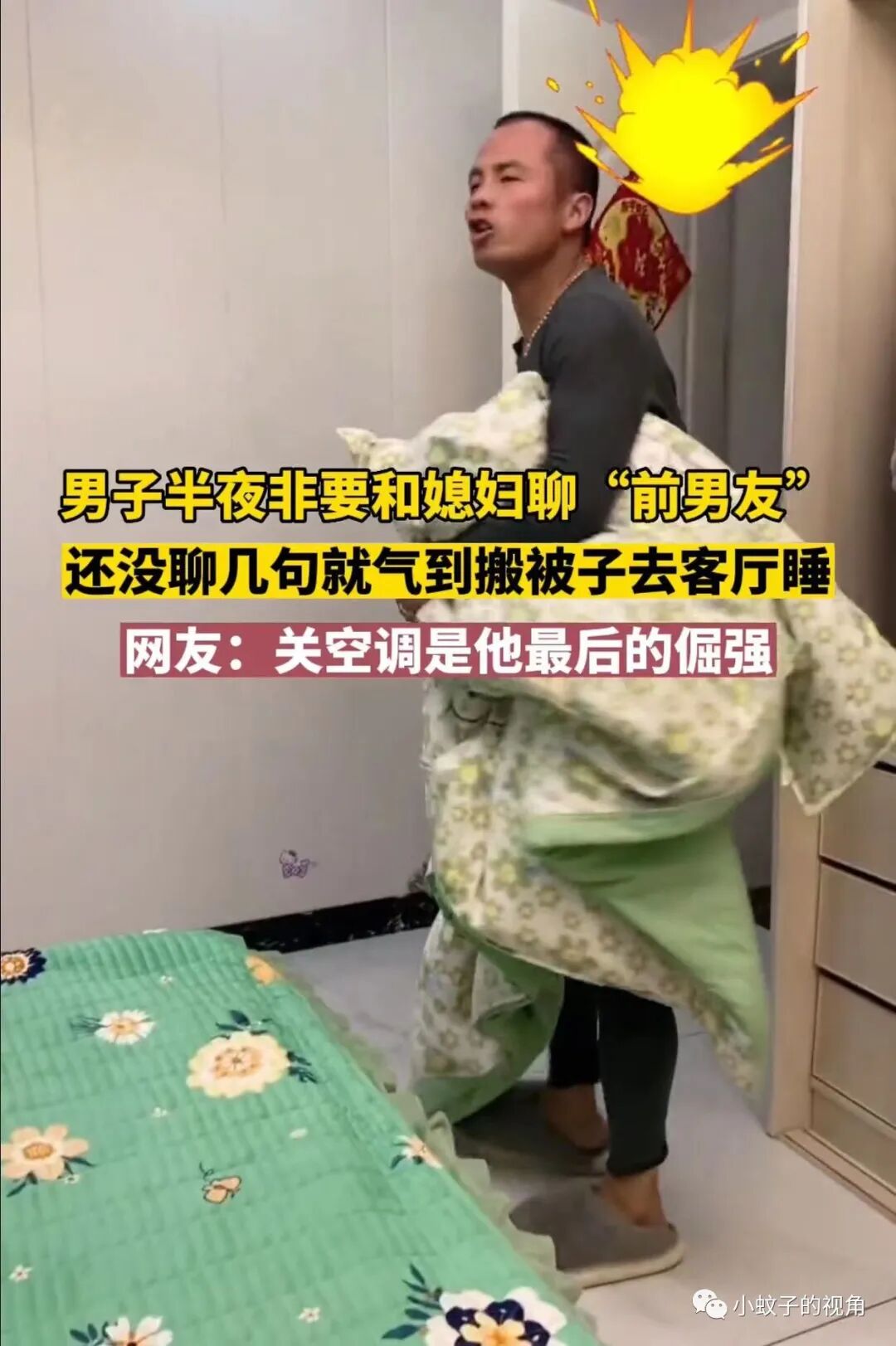 就像这对夫妻一样,大半夜男子搬着被子要去客厅睡觉,老婆拉都拉不住!委屈地说:他非让我谈谈我的前男友。
