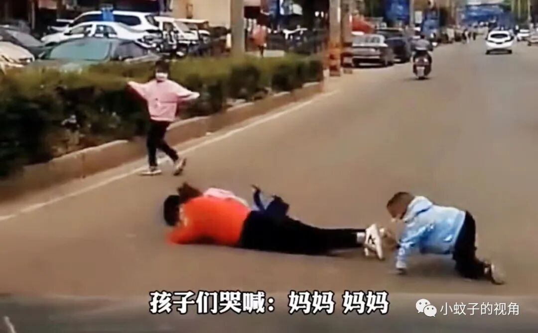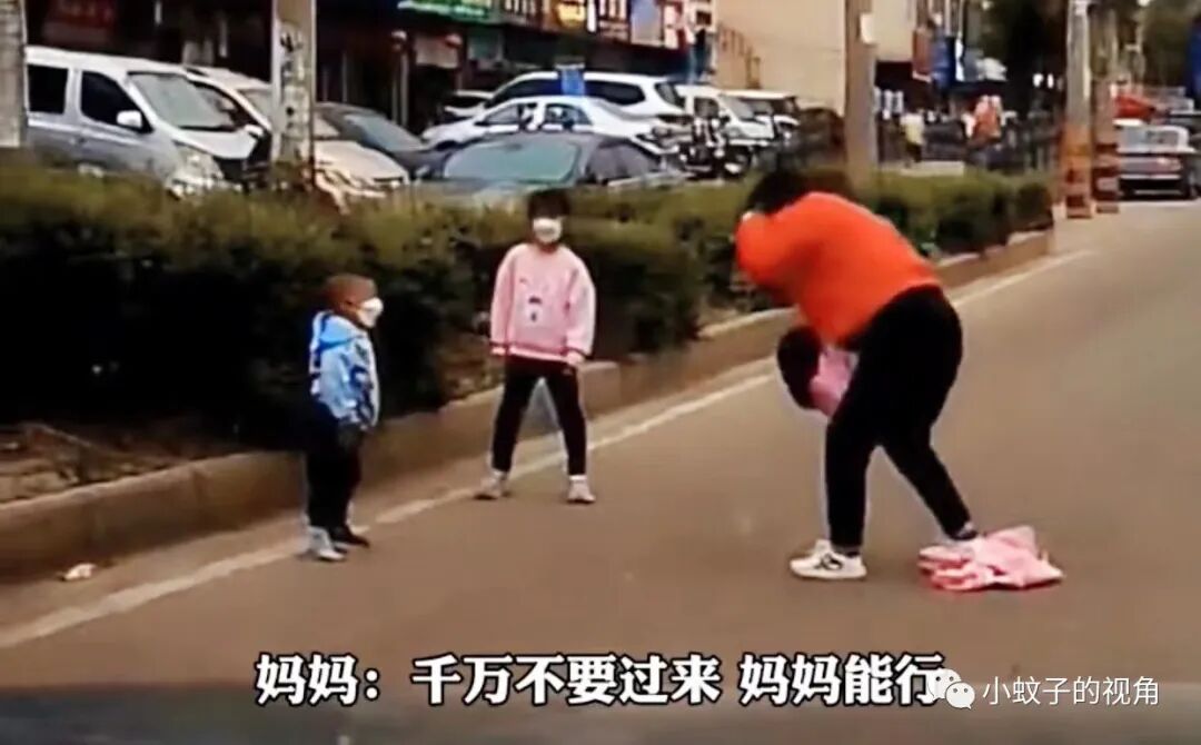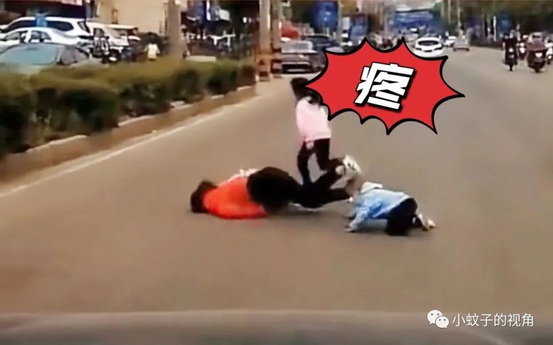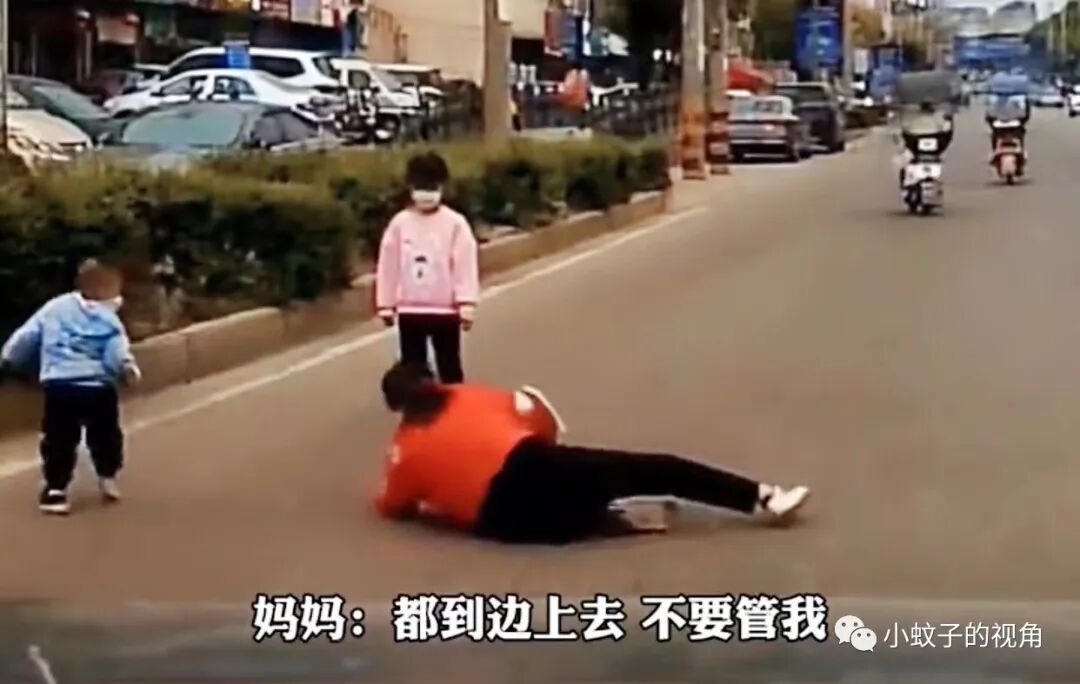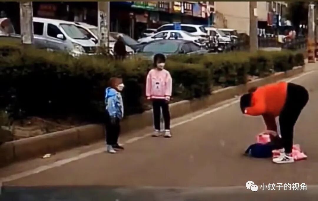 但是,这位妈妈却感觉自己摔倒在马路上太危险,冲着孩子大声喊:“都到边上去,不要管我”。