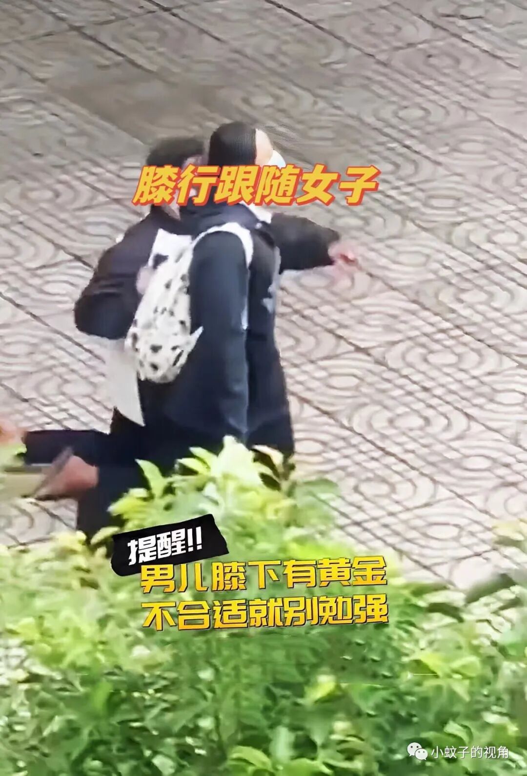 女子见状,只好回头往相反的方向走去,男子不依不饶,跪在地上膝行追赶了一段距离,见这样追不上女子,才站起来继续追赶。