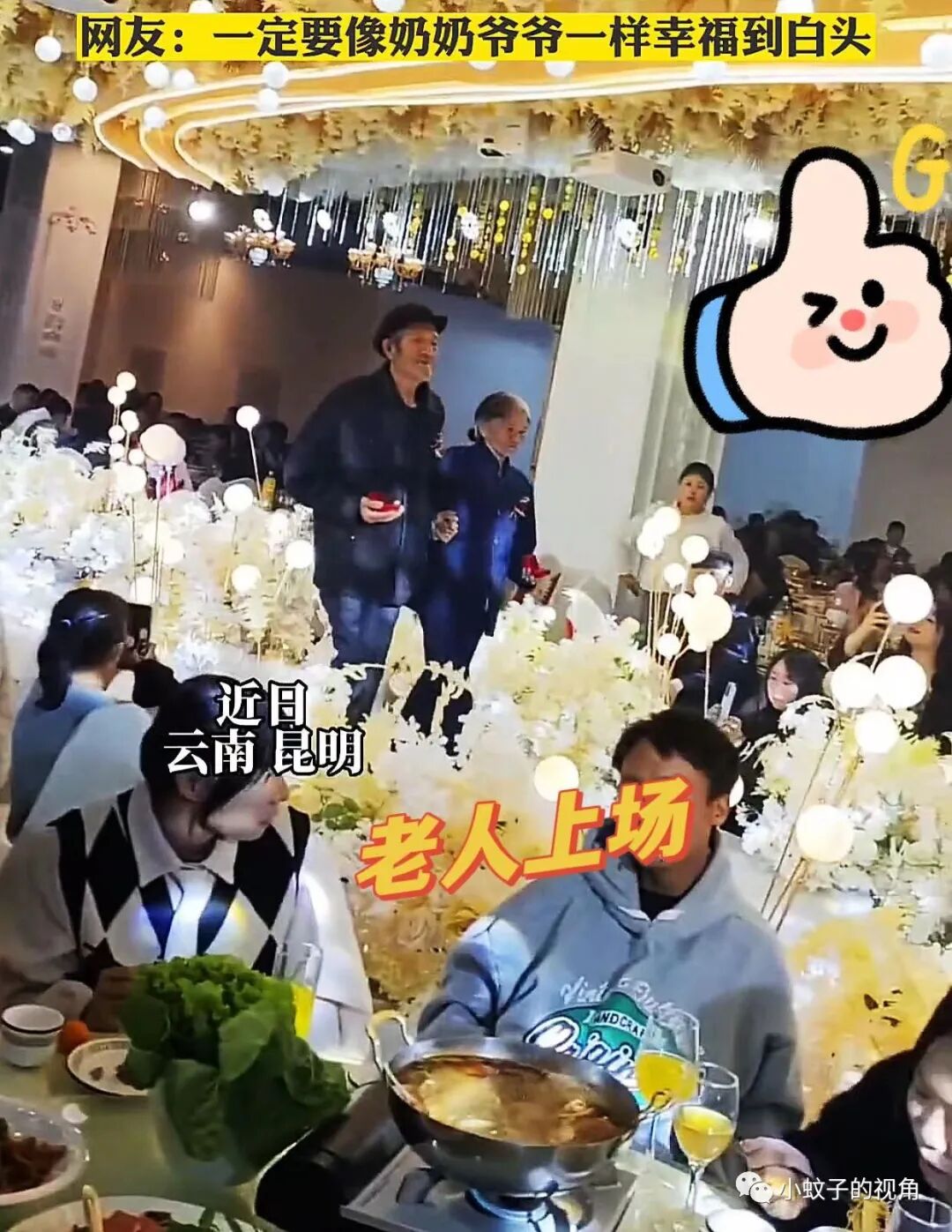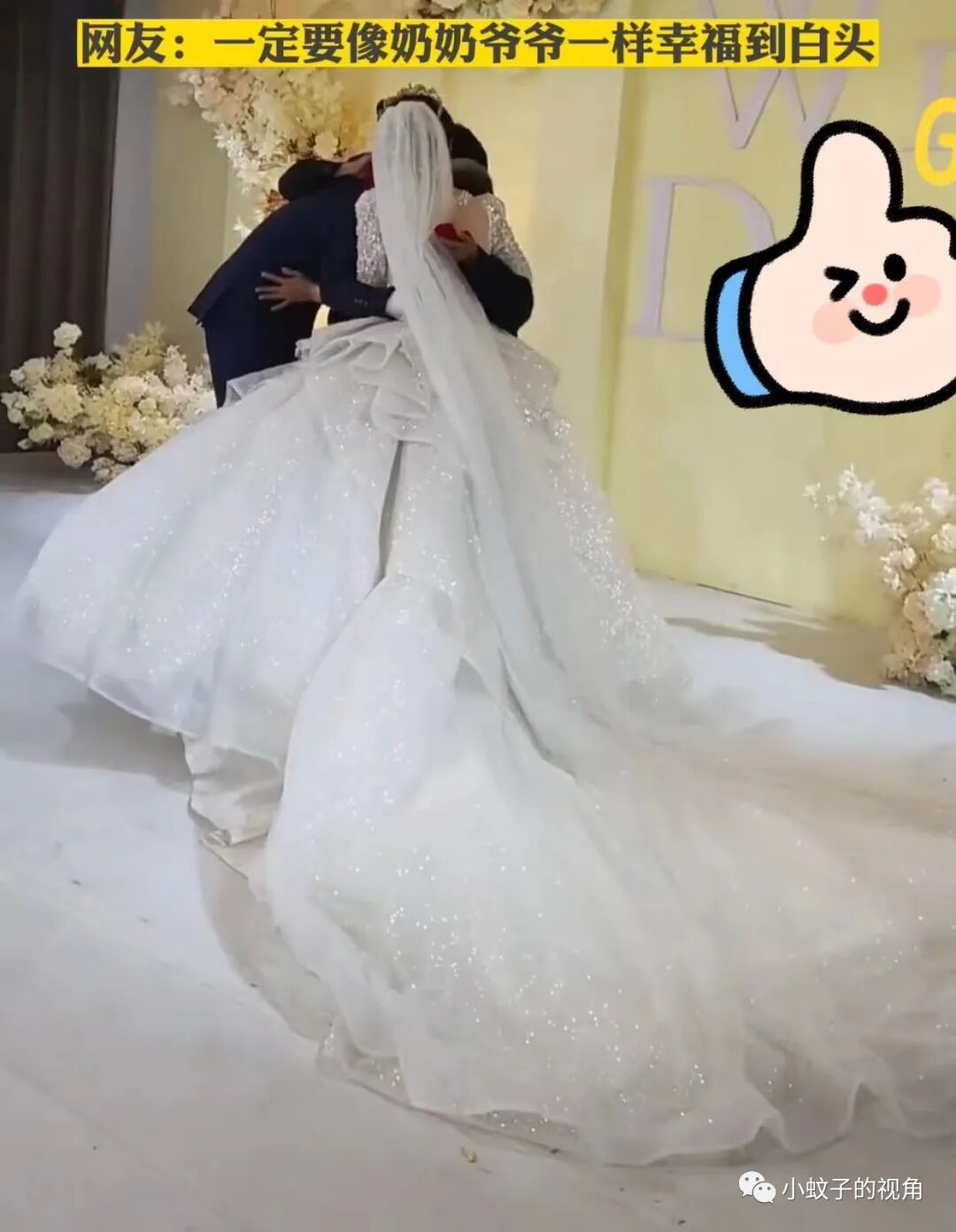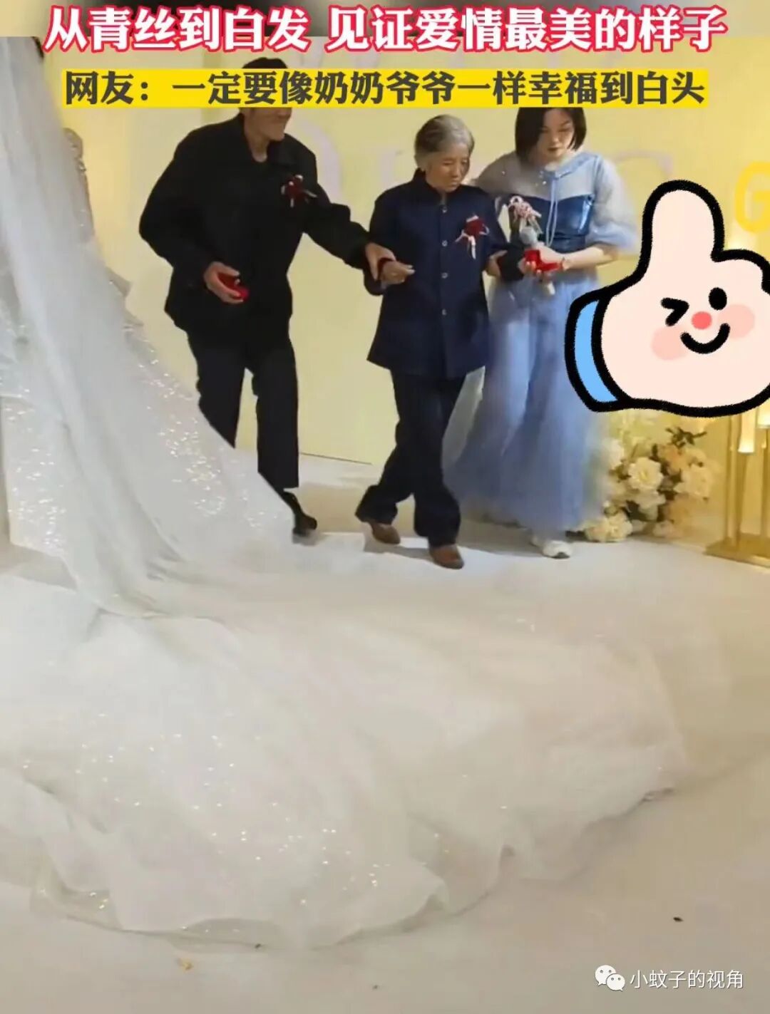 祝这对新人也能像爷爷奶奶一样,哪怕经历生活的风雨,依然相依相爱,携手一生!真若如此,也算不辜负这对老人的祝福。