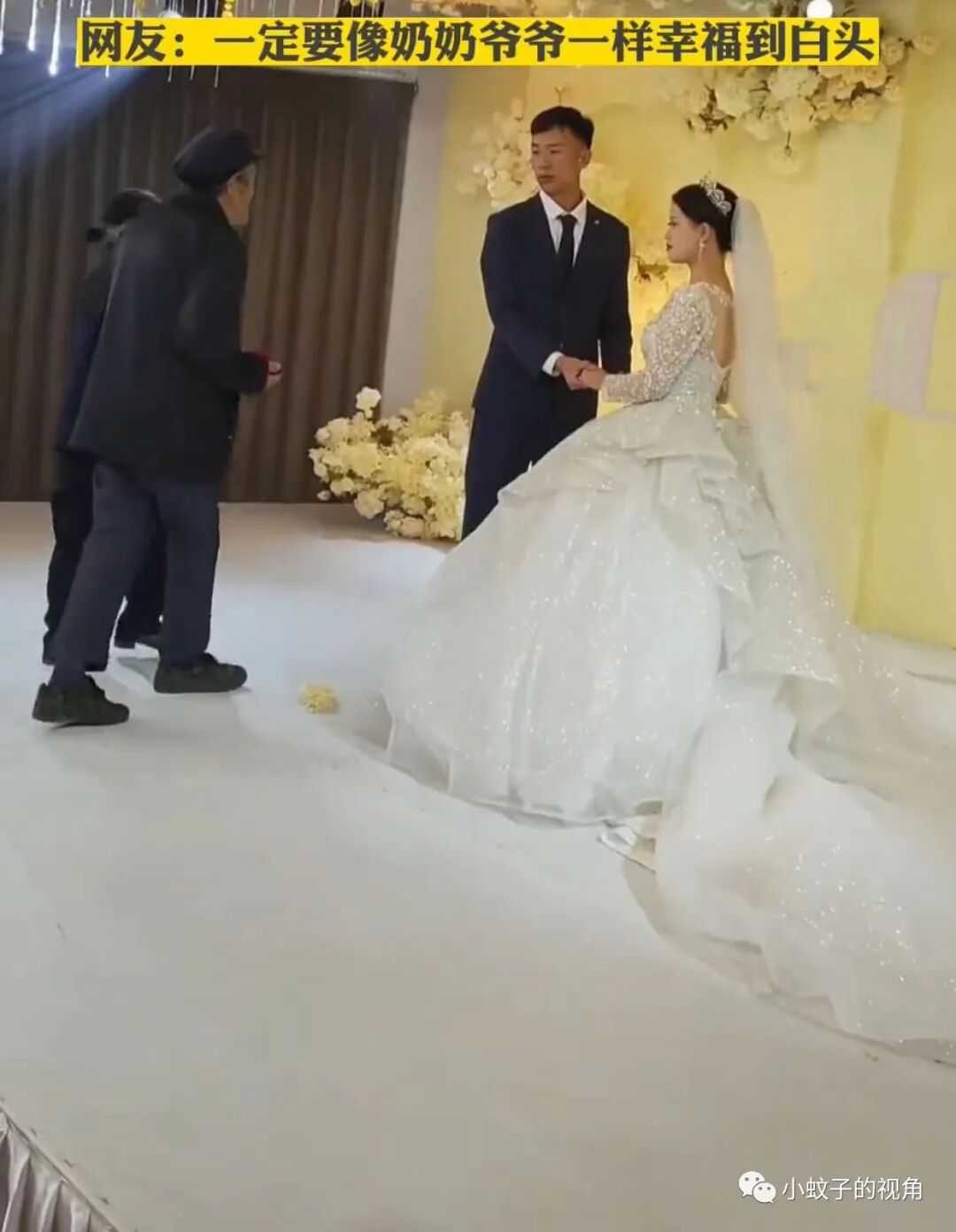 没想到,等到伴娘送戒指的环节,现场气氛突然一变!上场的并不是一位漂亮的伴娘,而是一对已经白发苍苍老年夫妻。