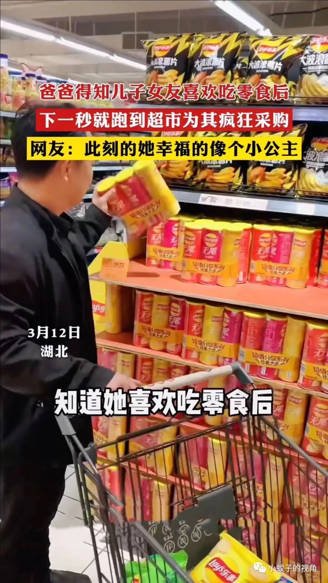 看着爸爸疯狂地划拉着货架上的东西,男子忍不住笑了:他买的都是零食!因为我跟他说过,女朋友喜欢吃零食!