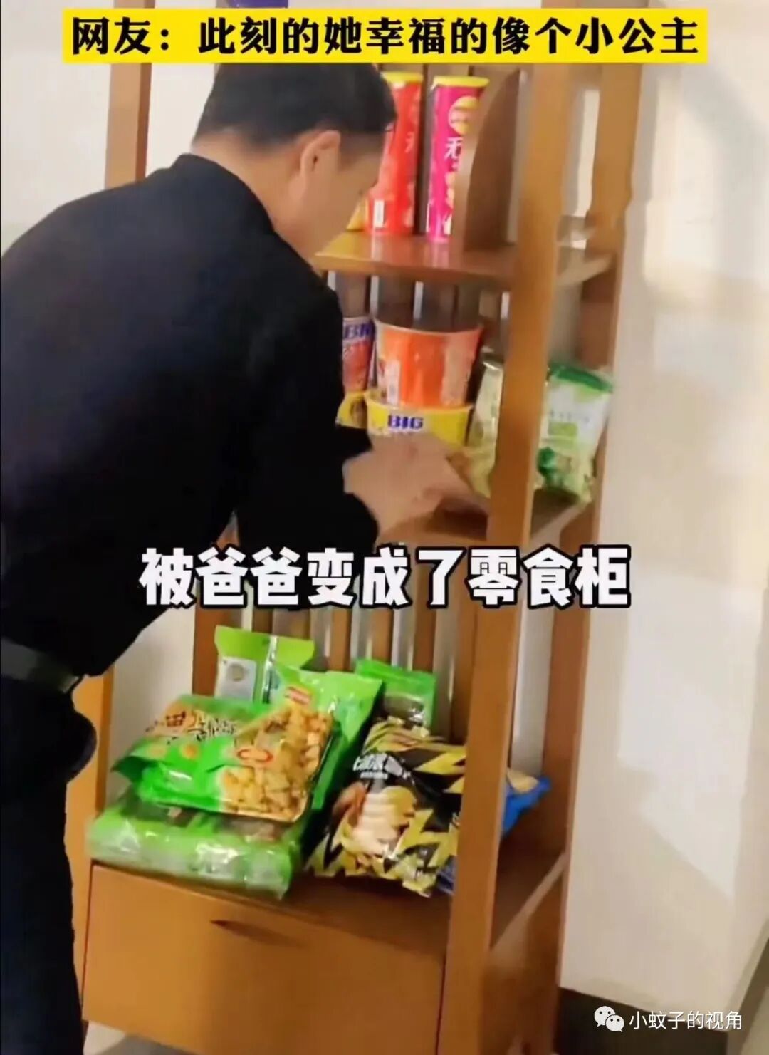 小柜子变身零食柜,父亲还告诉女孩:这些都是你的,吃完了告诉我,我再给你买。
