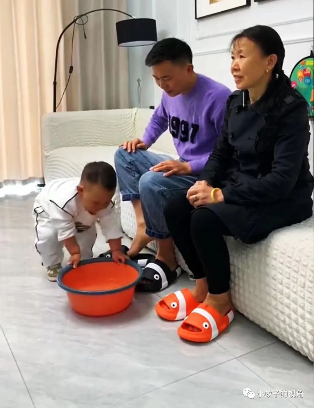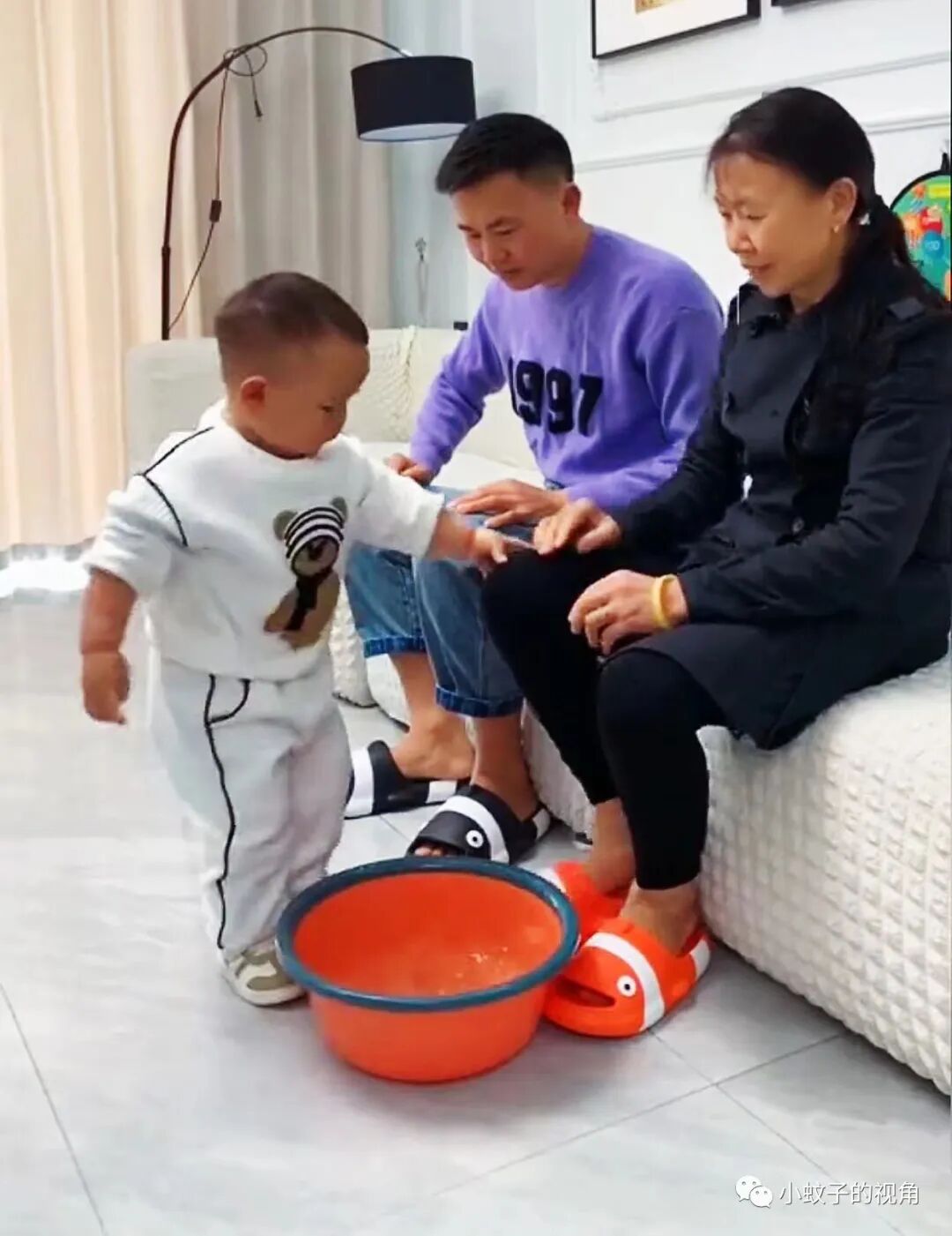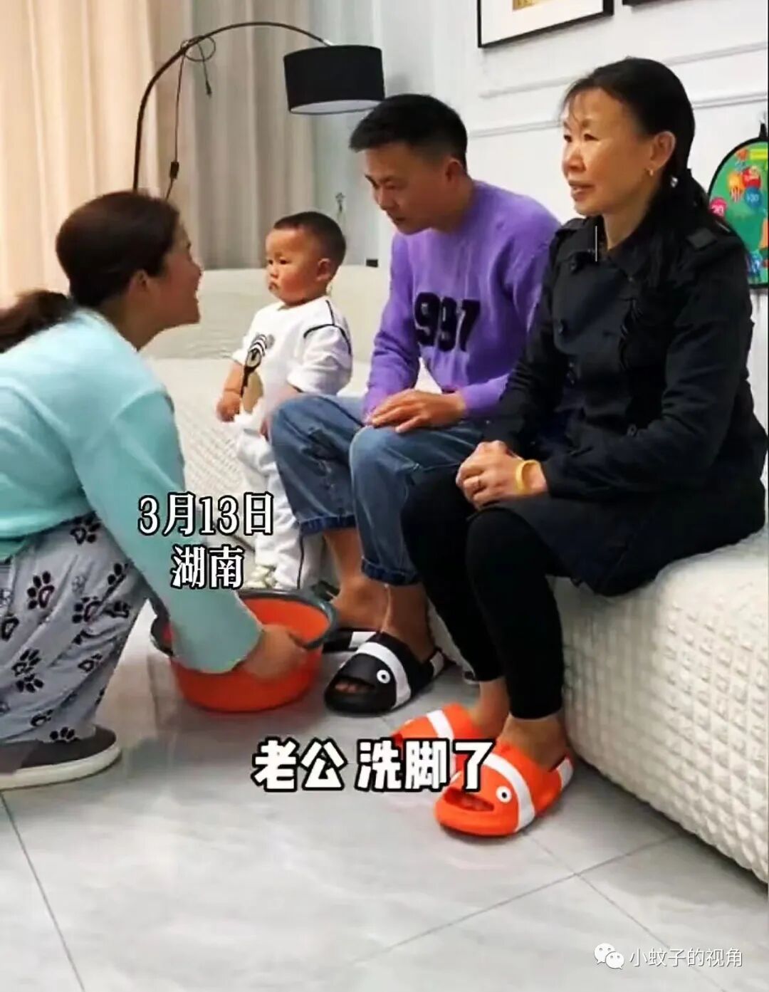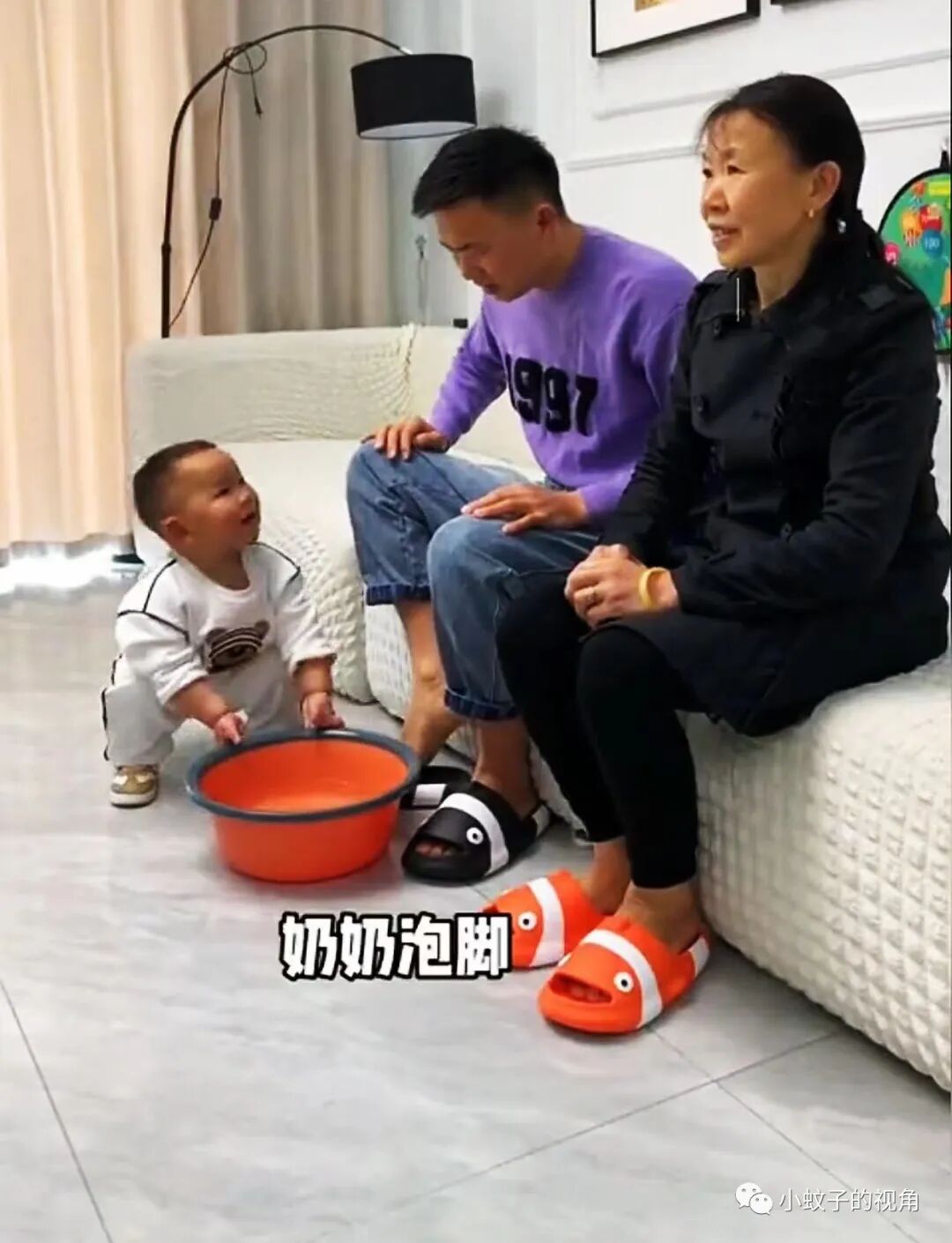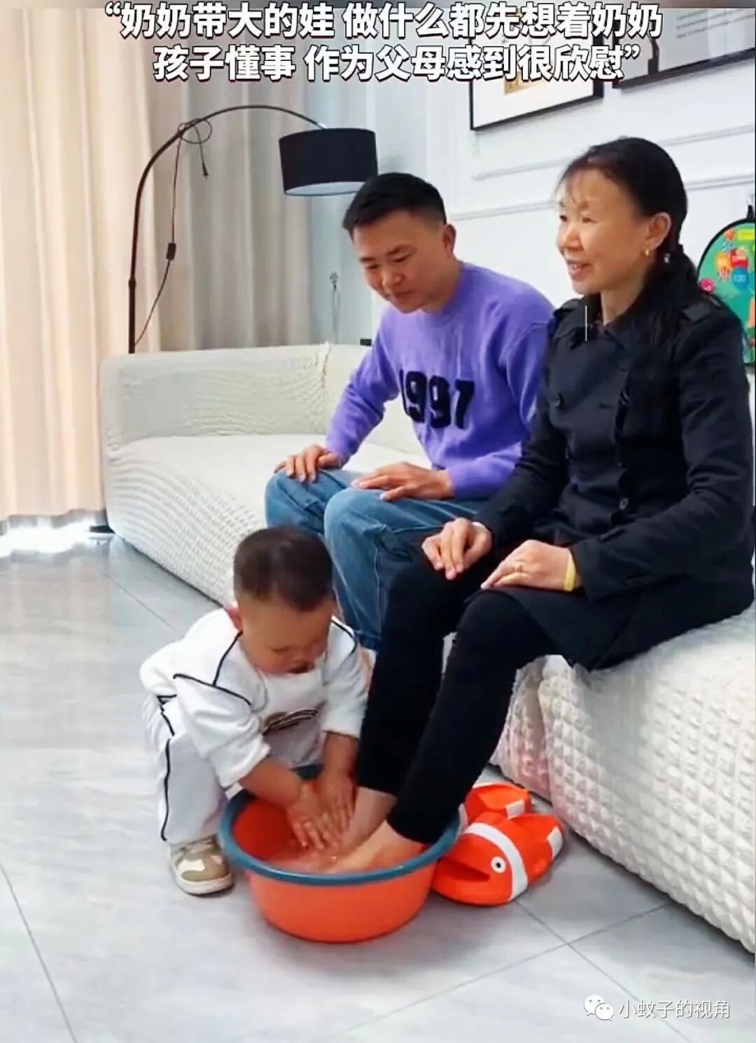 但是,今天当她把这盆洗脚水放在老公身边时,在一旁玩耍的孩子突然站起身,推着这盆洗脚水就送到了奶奶跟前,嘴里还说着:“奶奶泡脚喽……”。