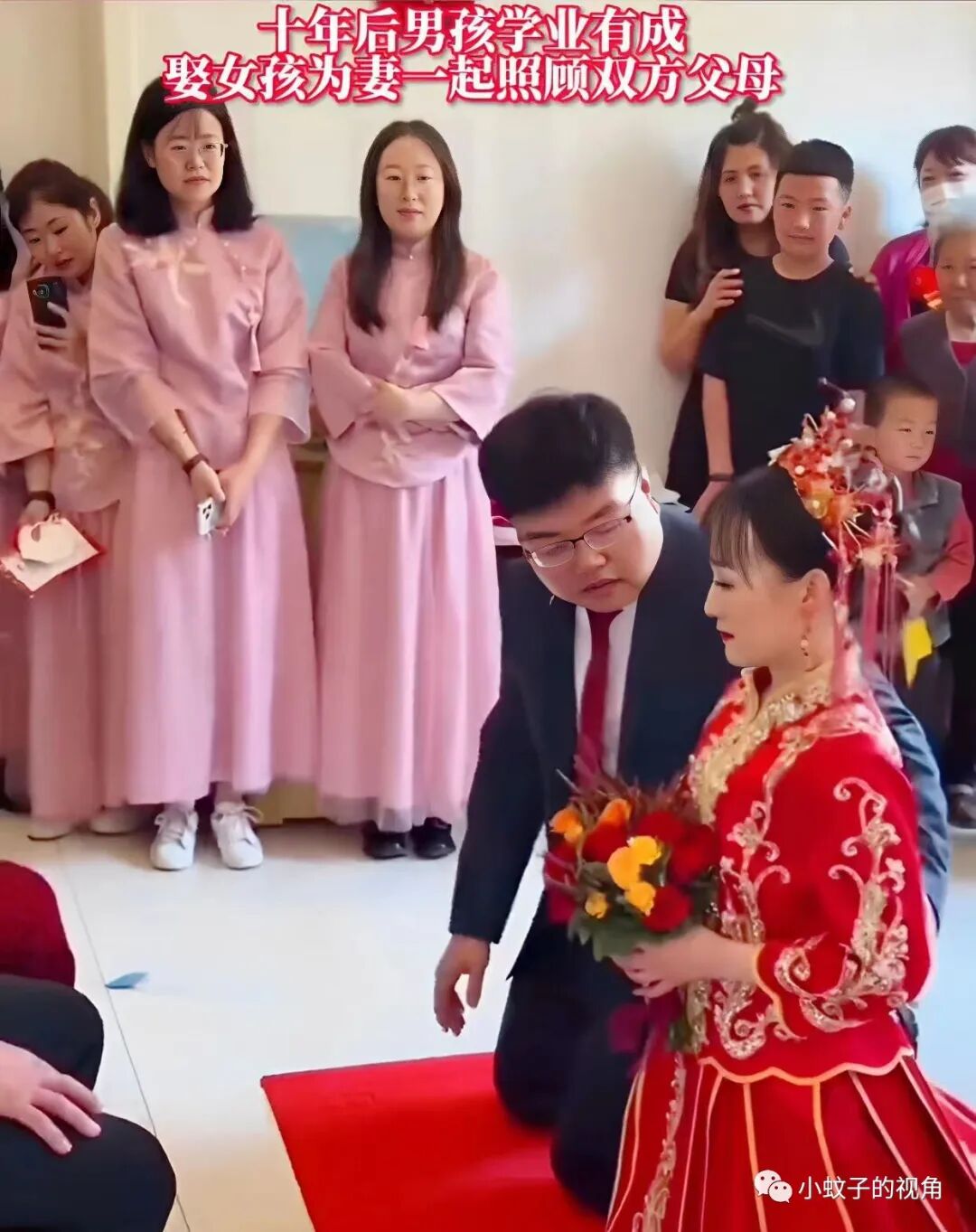 婚礼上,新郎满眼都是新娘。就连跪拜父母时,新郎都先弯下腰,伸手扶着新娘,仔细地帮她整理婚服,等她跪下后,自己才顺势跪在一边。