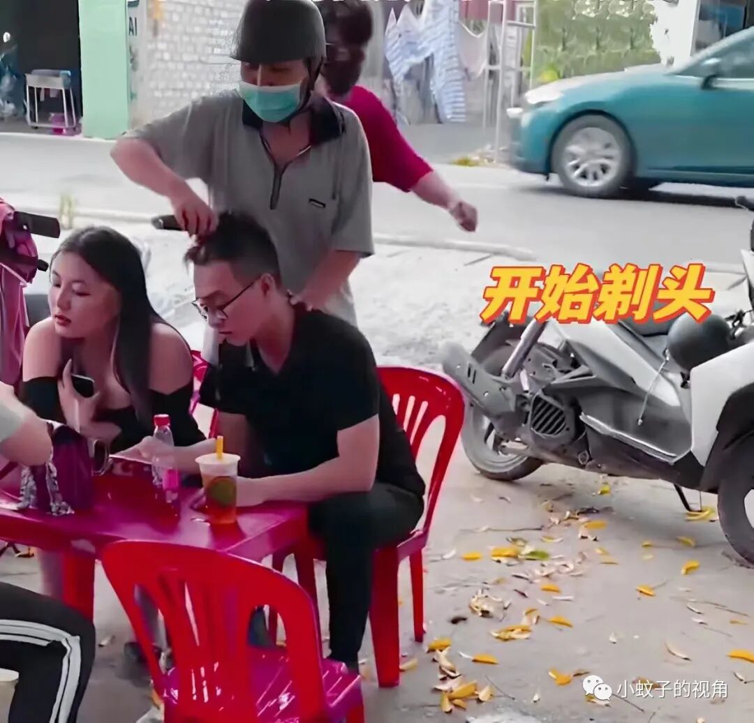 就像这名女子一样,老公在路边摊跟女性朋友喝茶聊天,她竟然拿着推剪将老公的头发剃光!