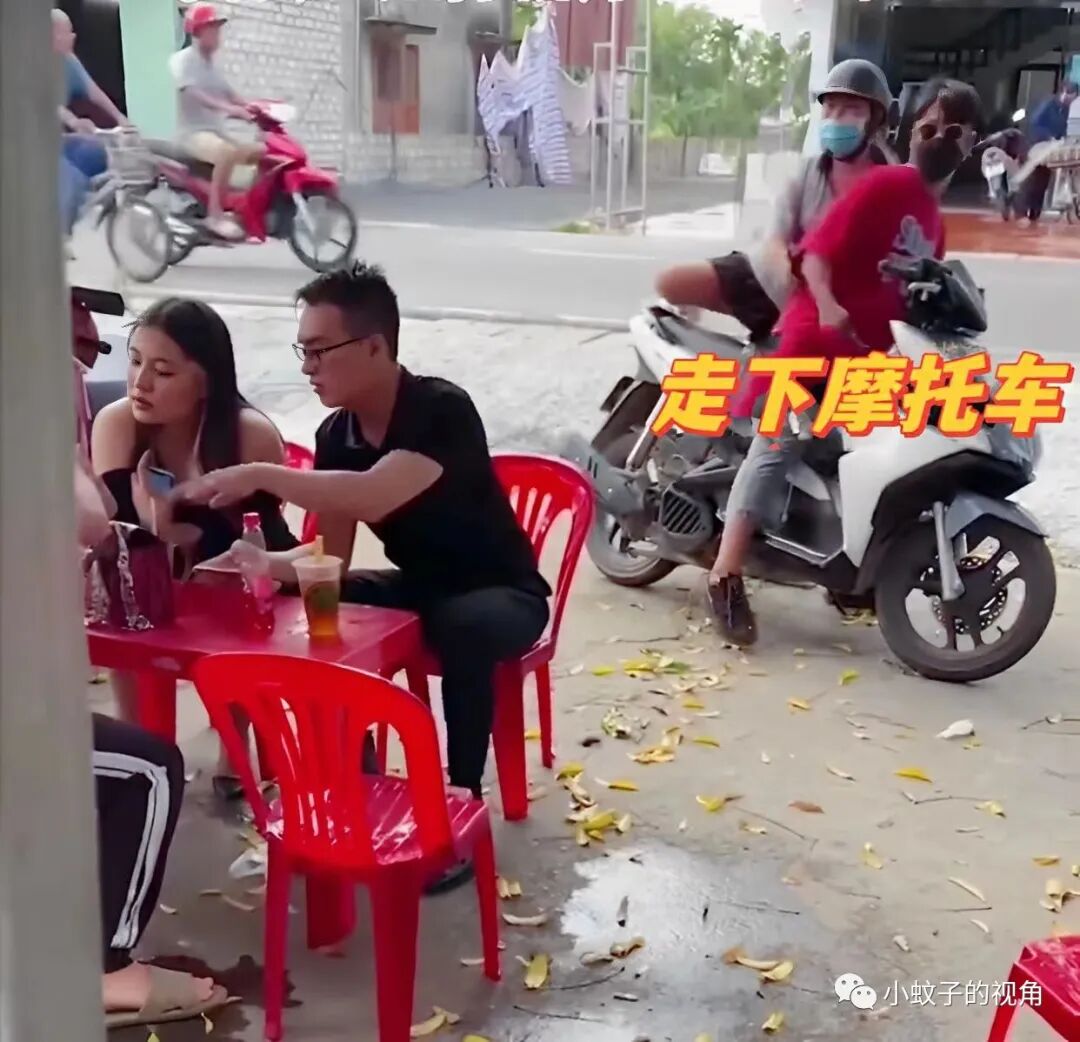 他正坐在街边跟女性朋友一起喝茶聊天,这时从路边匆匆过来一辆摩托车,车子由一名男子驾驶,就停在这三个人身后的位置。