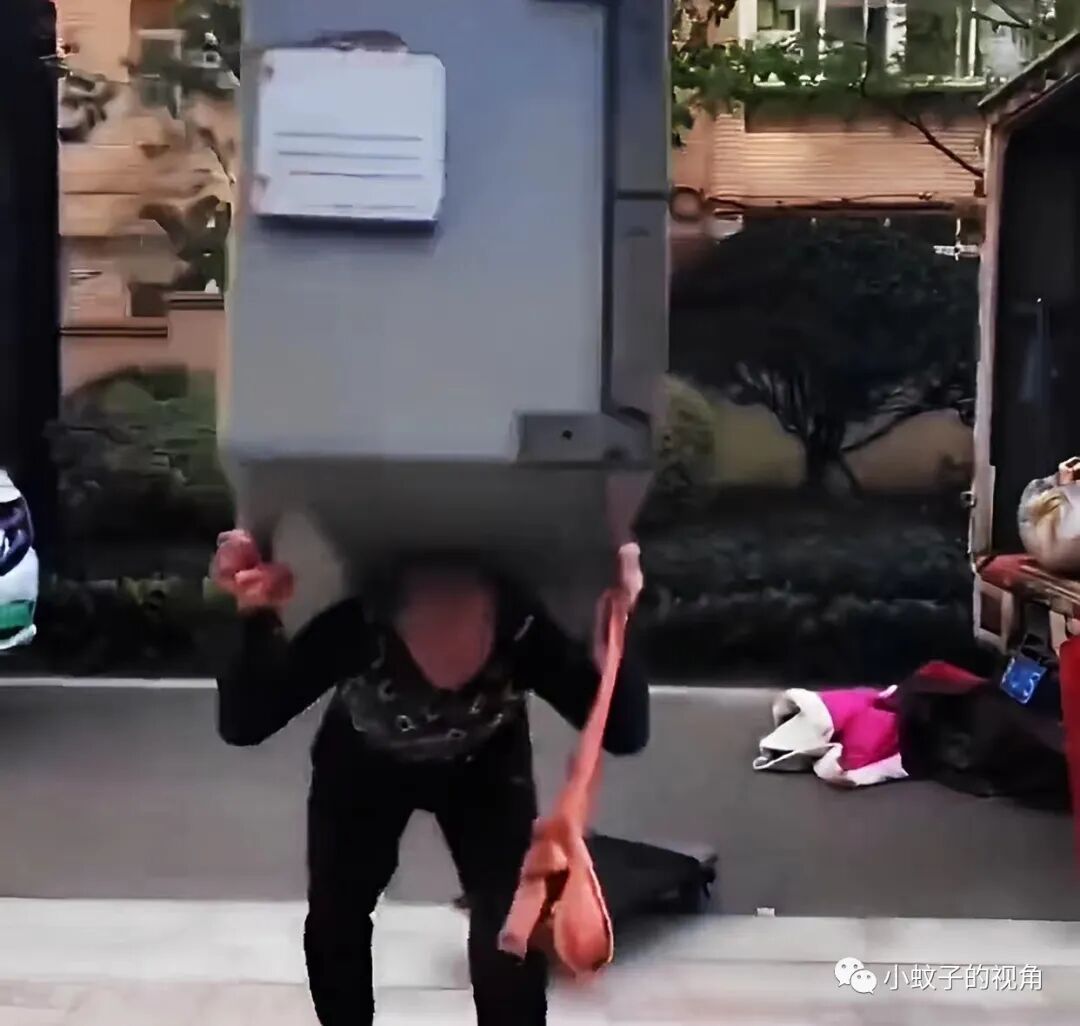 女子一旁看到心惊胆战,想要上前扶一把,又怕自己帮了倒忙。直到看着男子独自背起了冰箱,才算松了一口气。