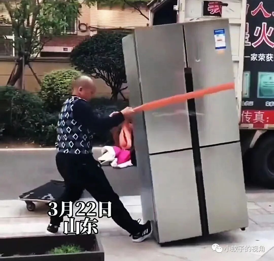 只见男子拿出一根绳子,讲绳子捆在冰箱的中上端,另一端用双手紧紧地抓牢,用力往前拉下,将冰箱拉的倾斜过来。