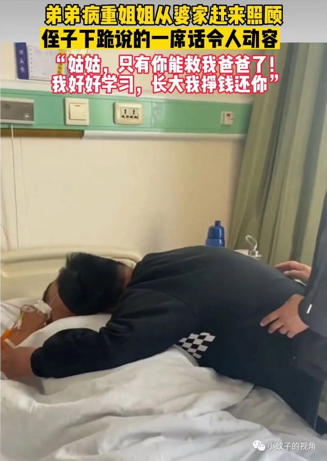 就像这位女子一样,弟弟病重,她从婆家赶回老家照顾弟弟,侄子对着姑姑下跪,一席话说得令人泪奔:这就是亲情啊!