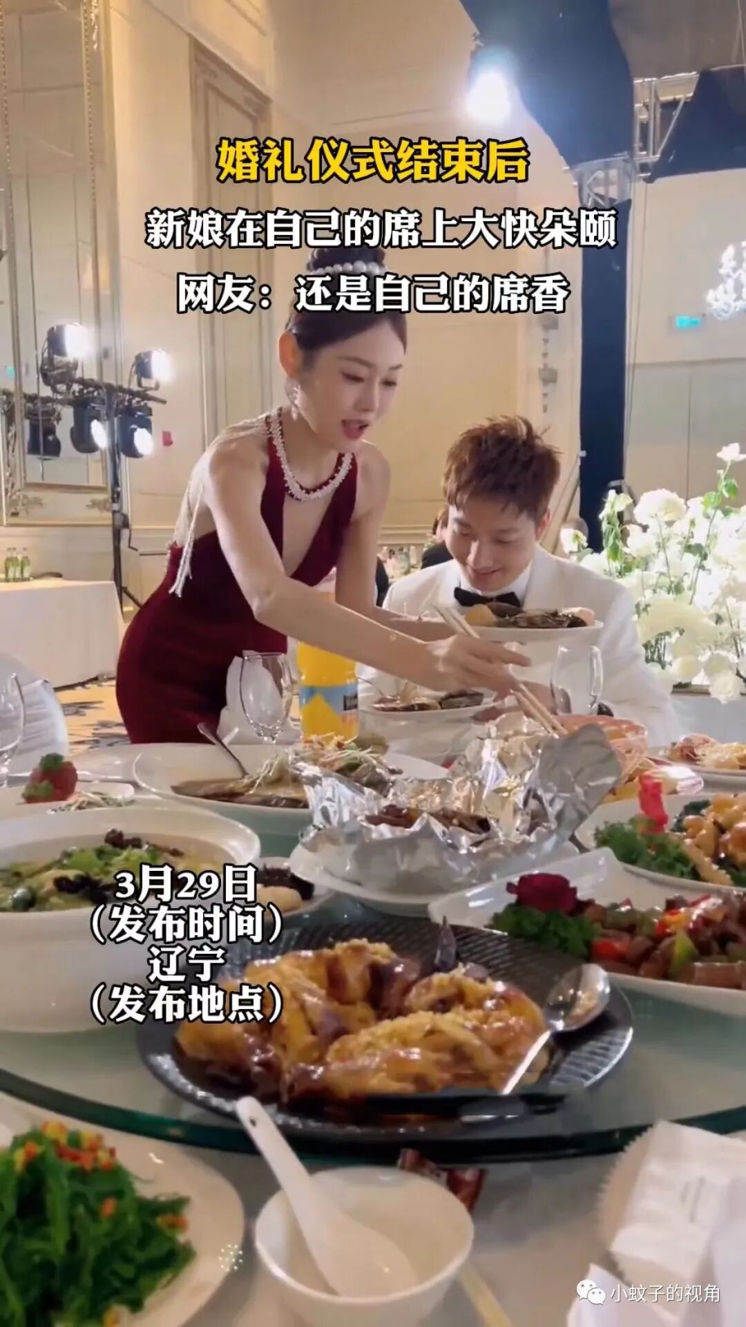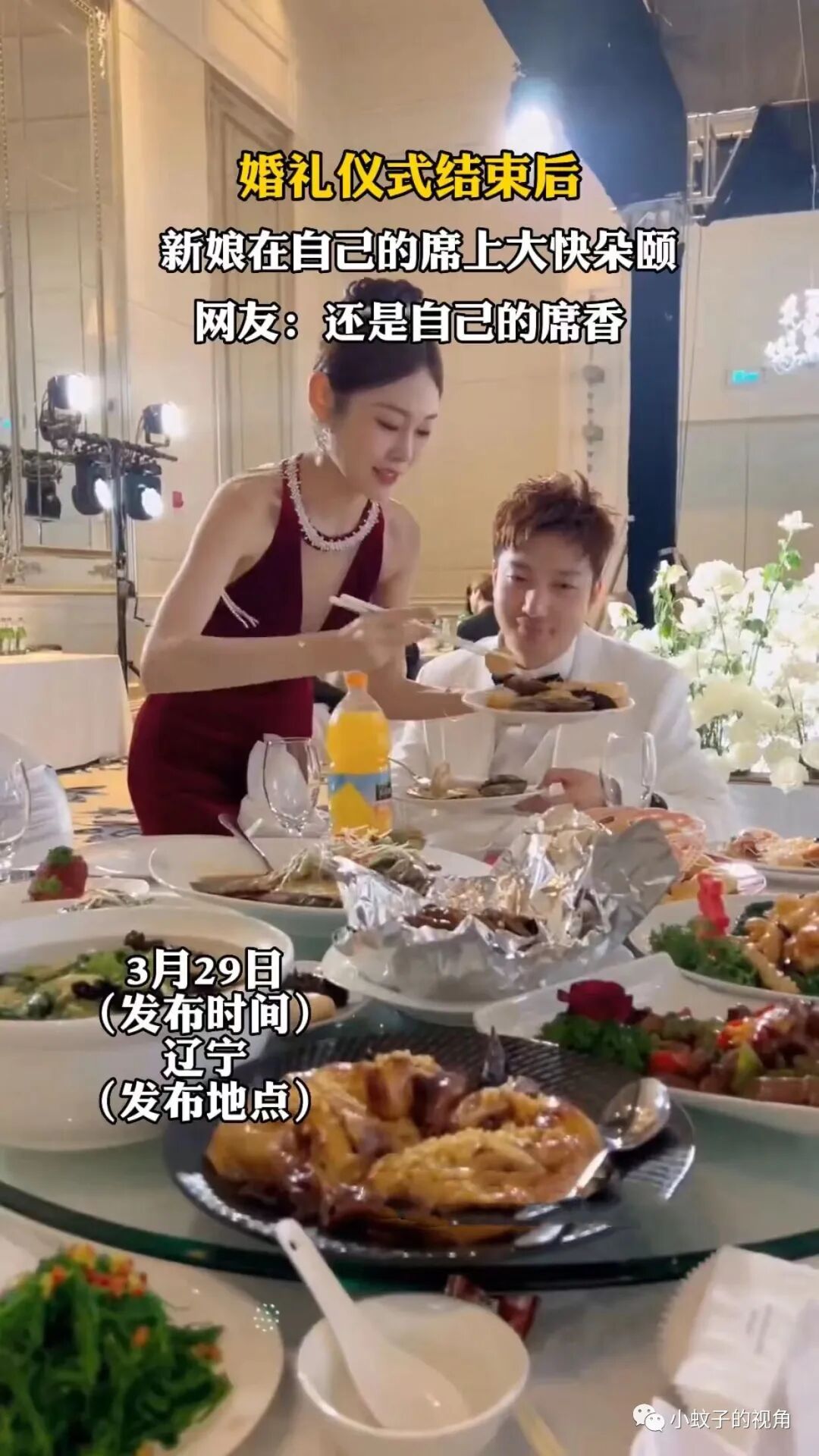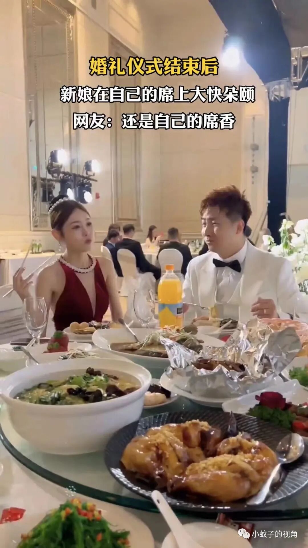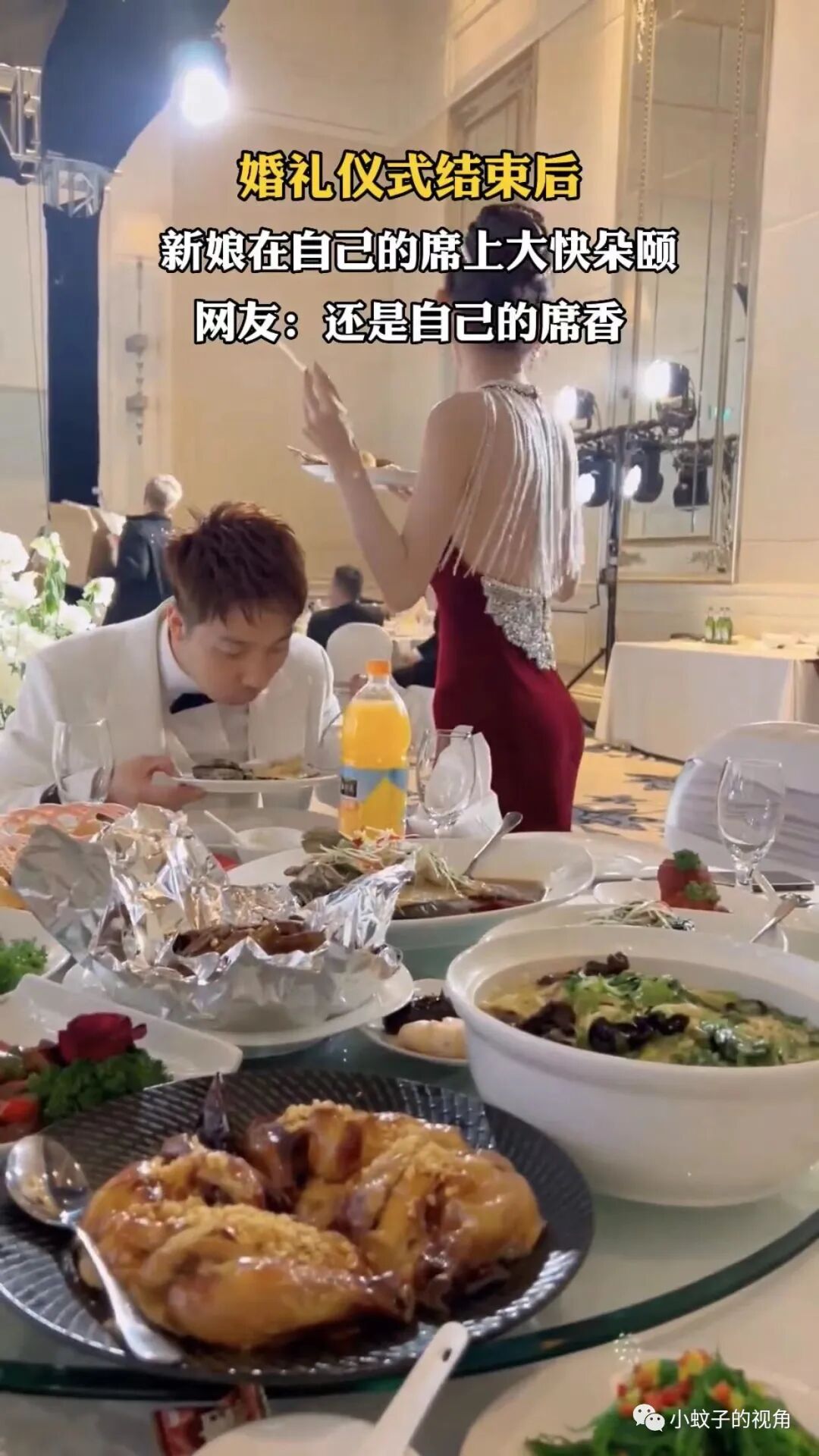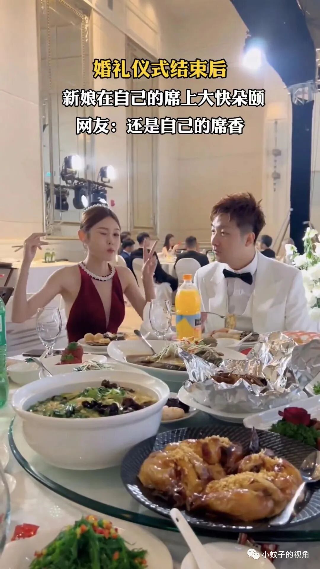 这对新人却是个例外,特别是这位新娘,等到婚礼仪式结束后,她在自己的宴席上大快朵颐,新郎看向她的眼光充满温柔。