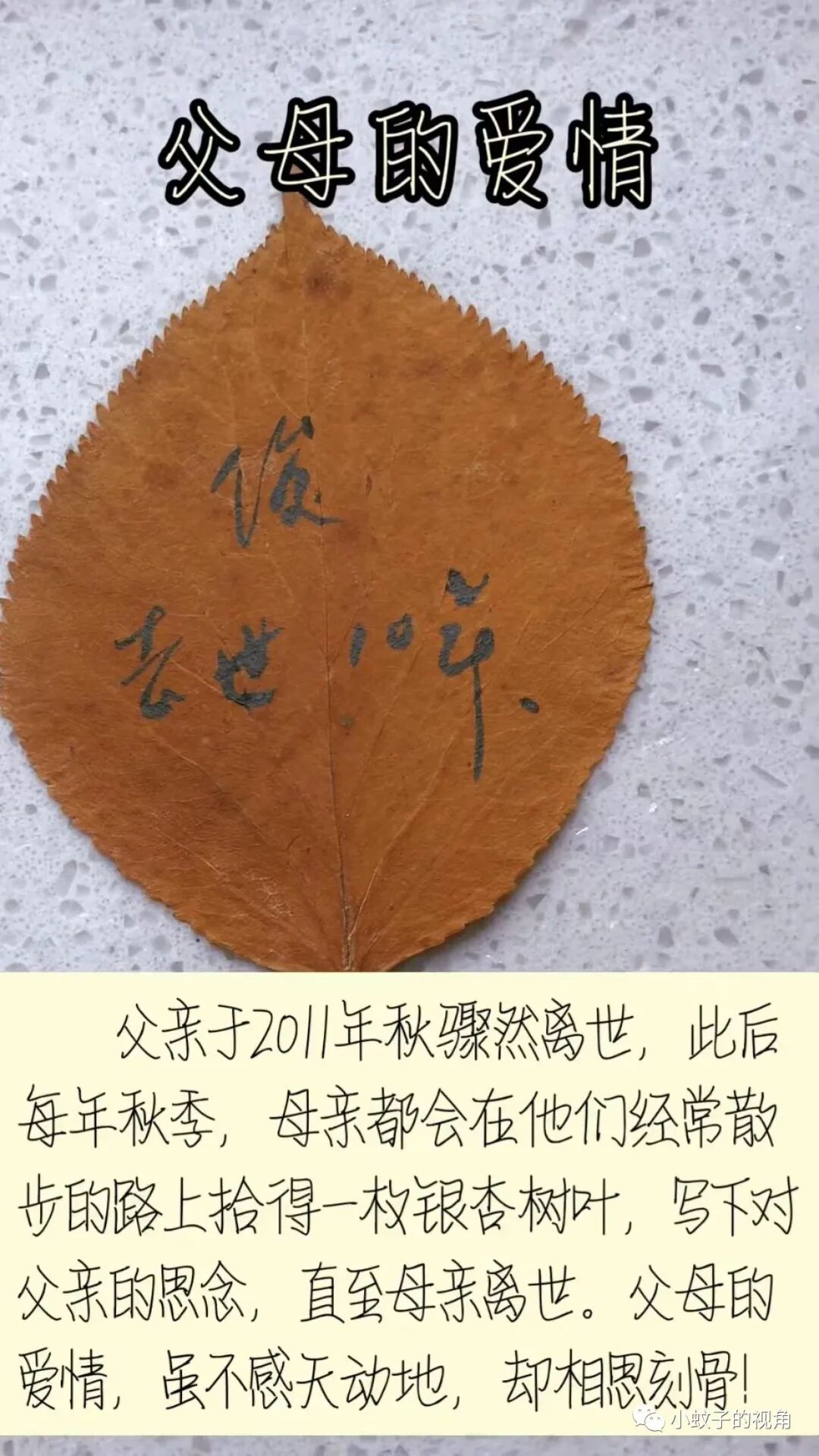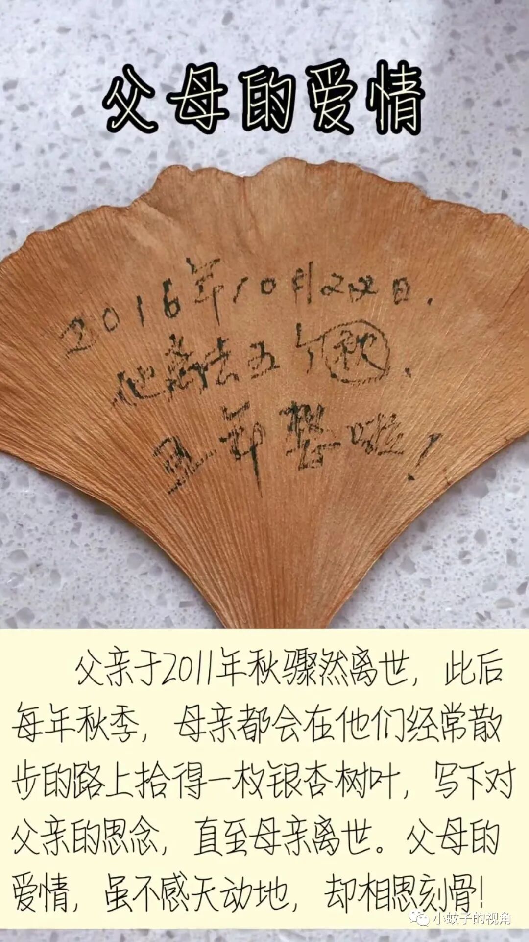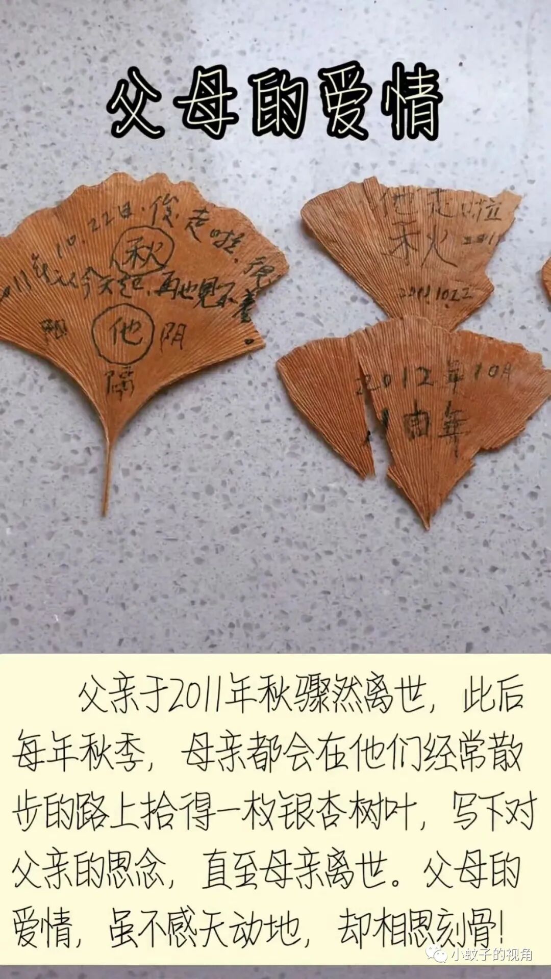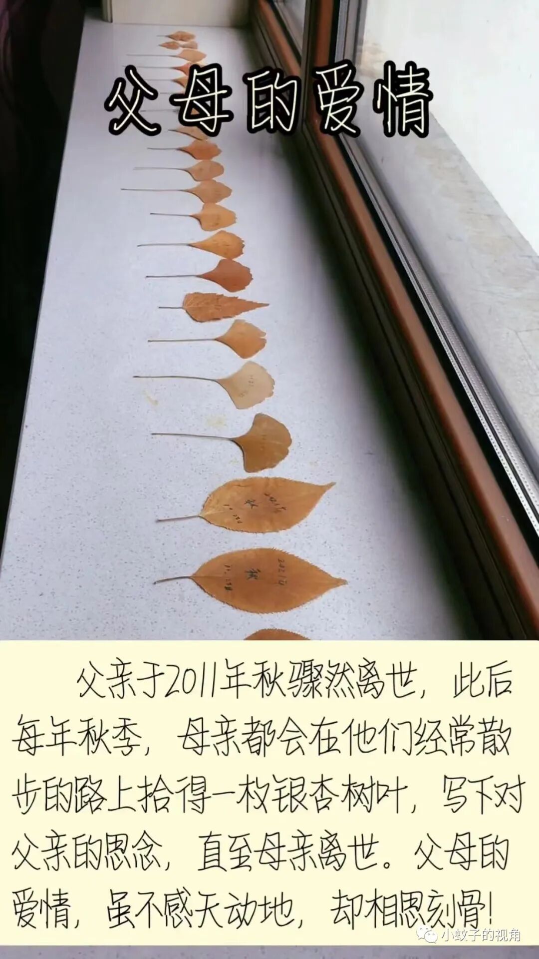 女子说,父亲是2011年秋天骤然离世的,从那以后母亲每年秋天,都会在他们经常散步的路上捡一片银杏树叶,写下对父亲的思念。这一行为一直到母亲离世。