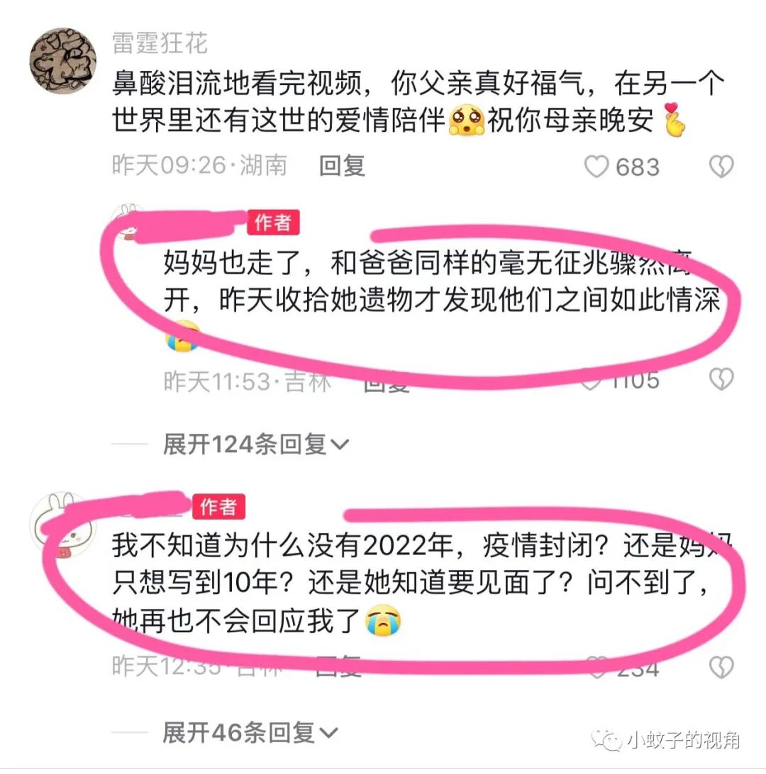 女子回复:现在母亲也走了,跟父亲一样毫无征兆骤然离开,昨天收拾她的遗物的时候才发现他们之间如此情深。