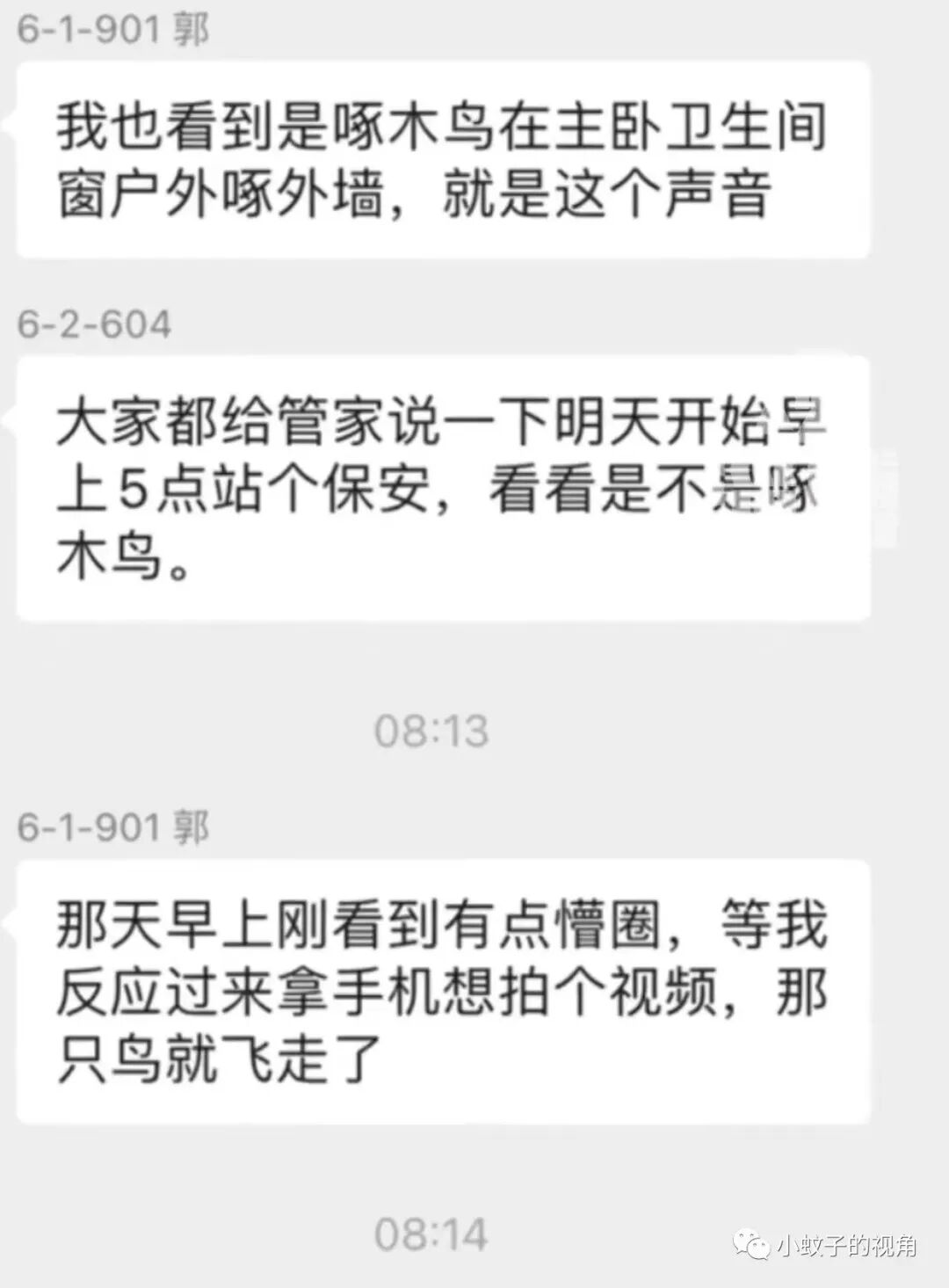 也有邻居说,大家给管家说一下,明天开始早上五点站个保安,看看是不是啄木鸟。
