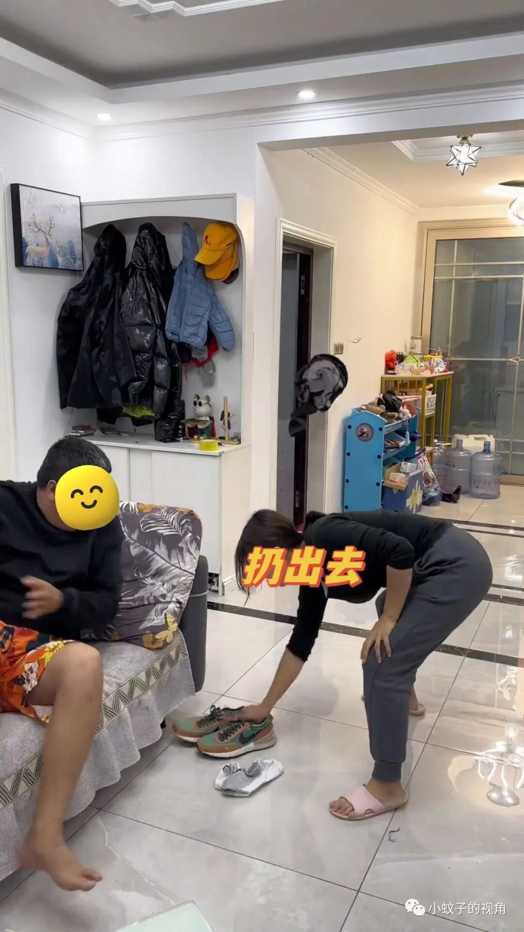 妻子怒了,却也没说话。而是打开房门,弯腰将老公扔在地上的裤子、袜子和鞋子统统扔到门口,打算给他扔出去。