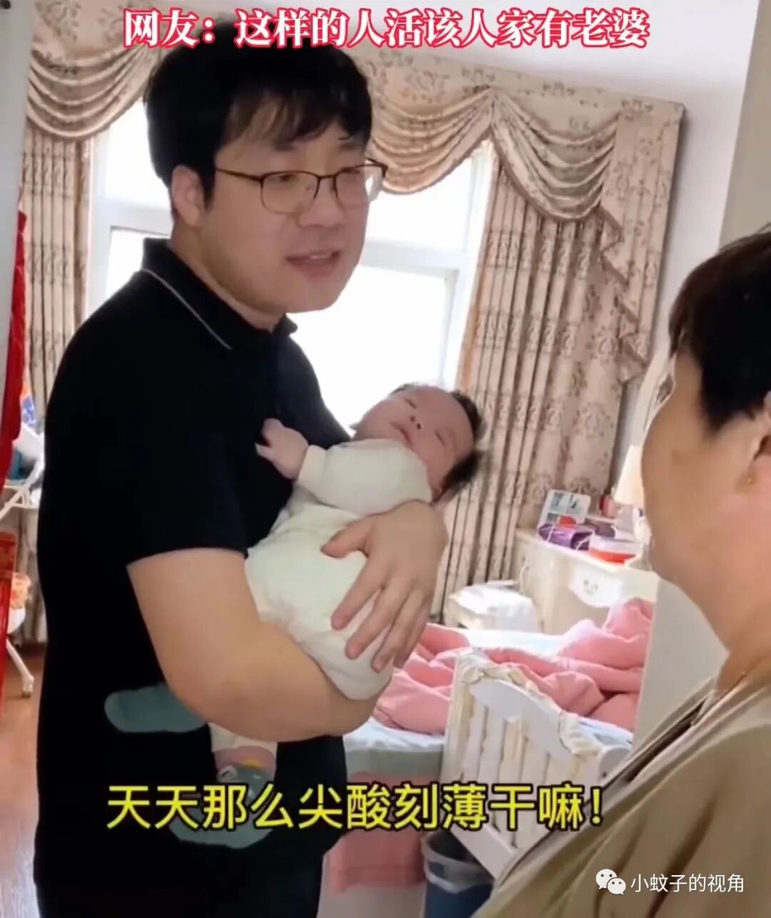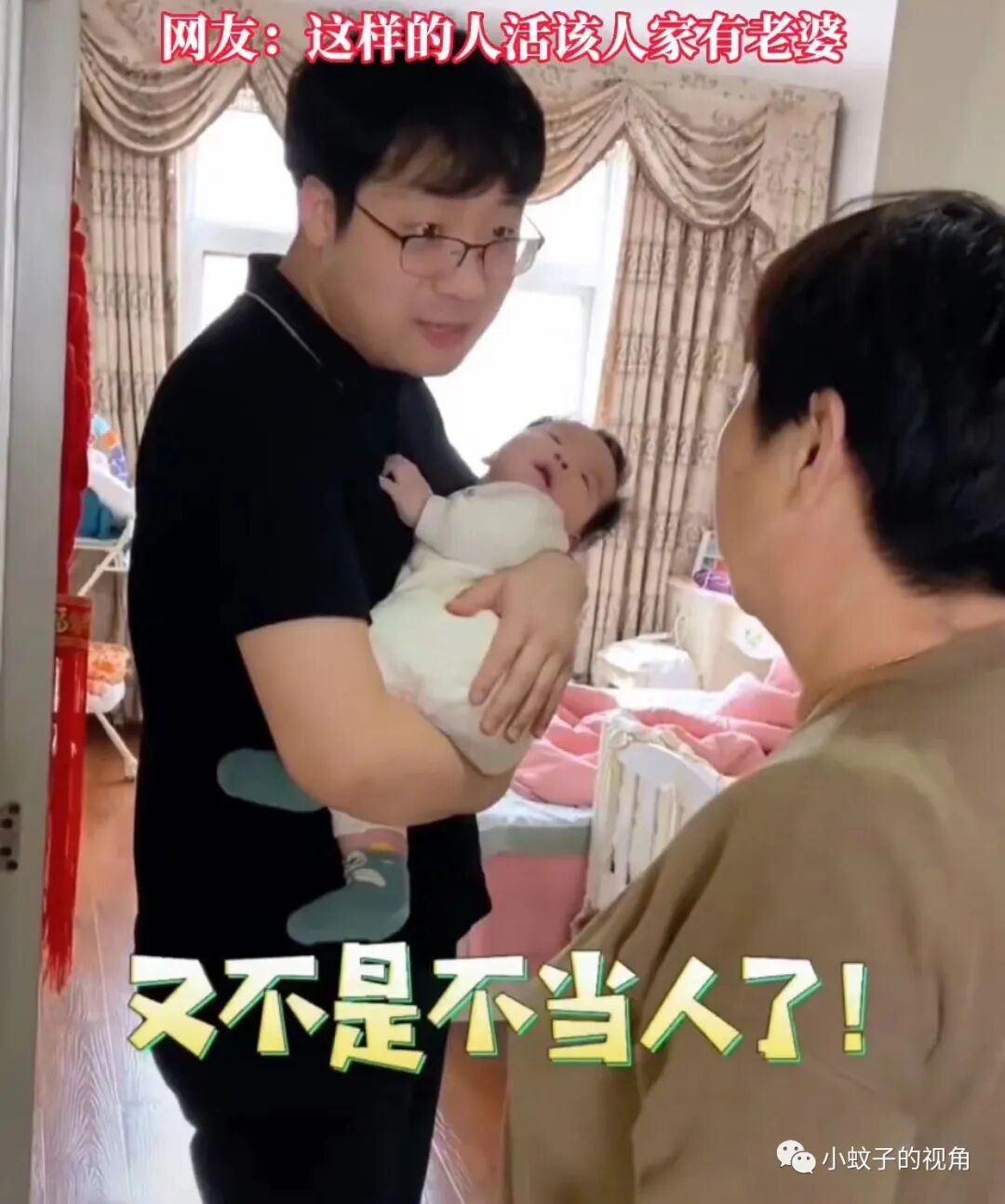 就像这位男子一样,妻子还在房内睡觉,自己抱着孩子哄睡,这一切引起婆婆不满,男子一番话引网友怒赞:她没嫁错人。