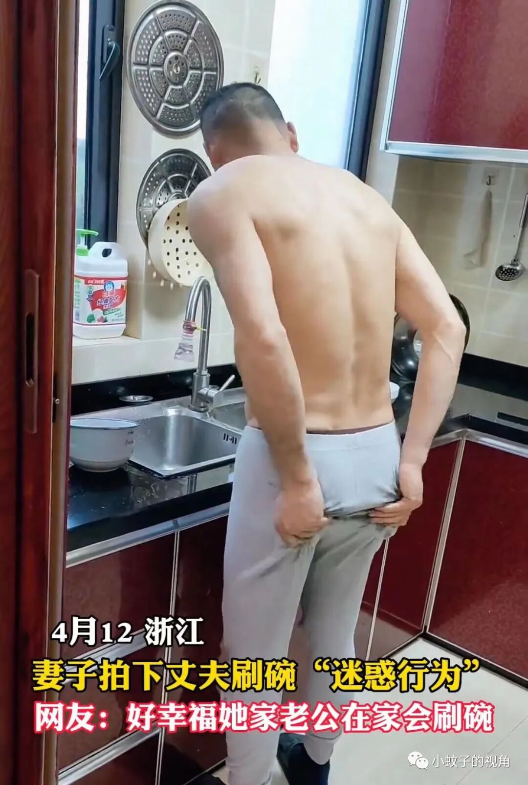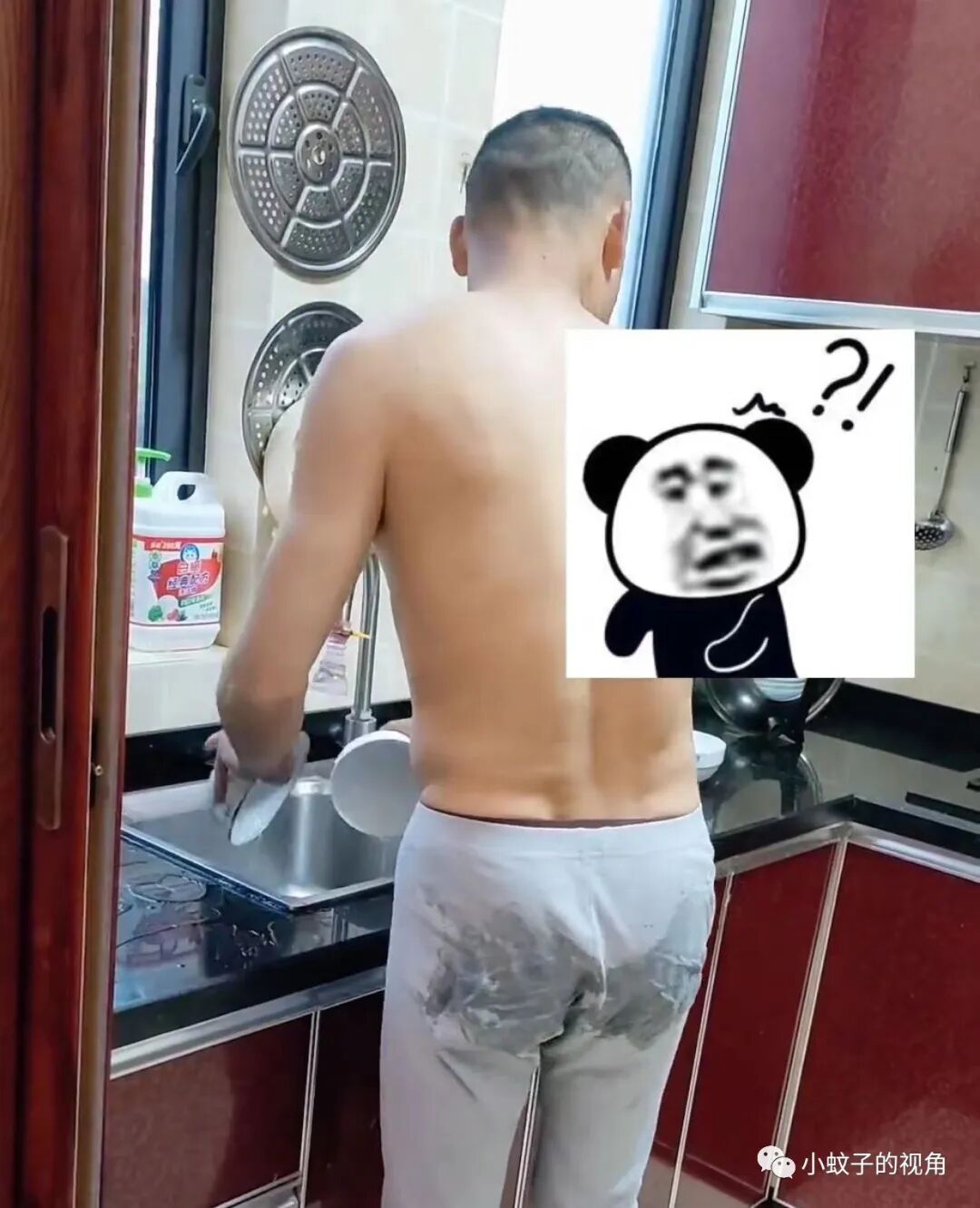 就像这位男子一样,一边刷碗一边不停地用秋裤蹭手,妻子被他的行为弄蒙圈了:他这是穿了块抹布?