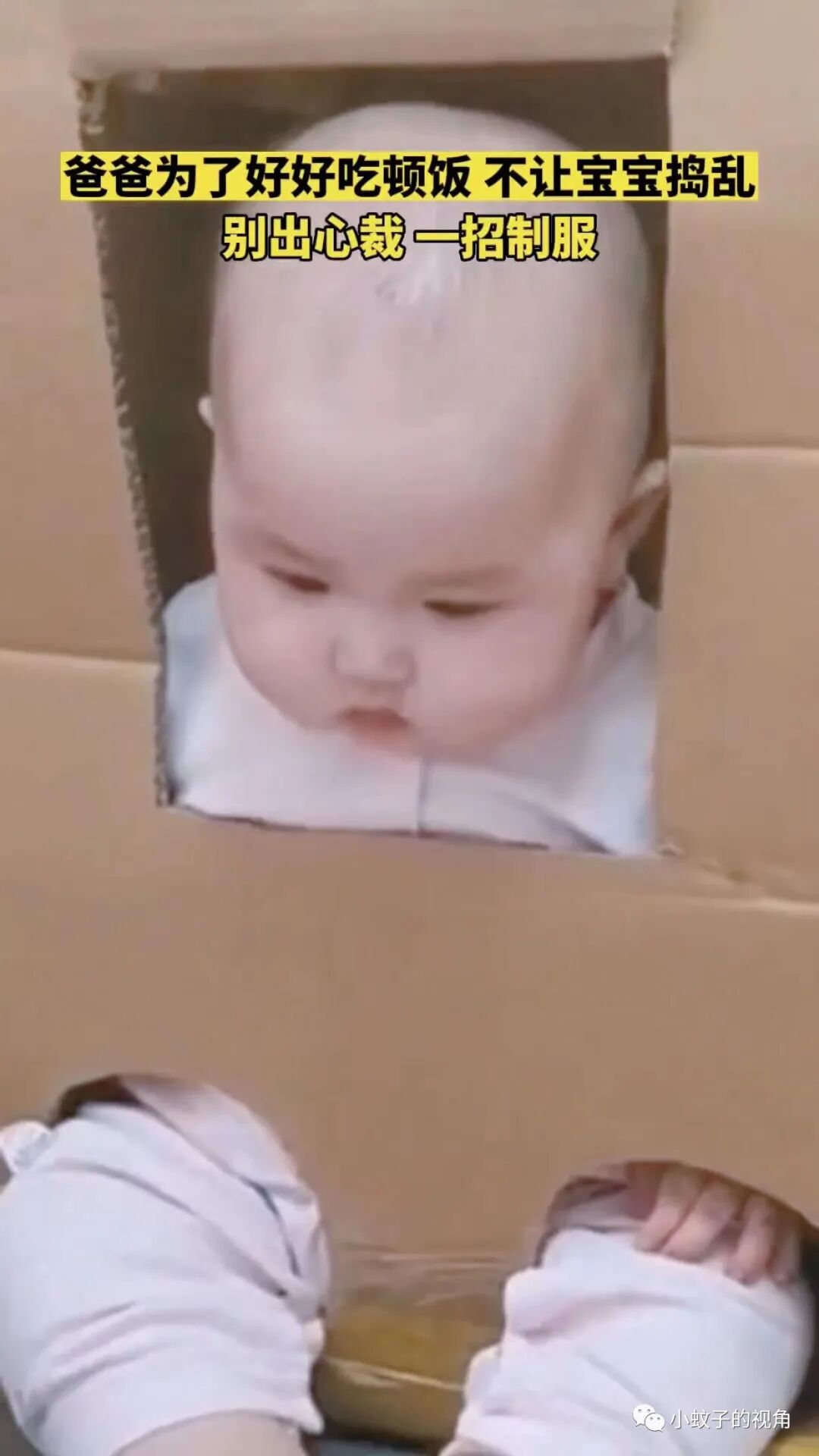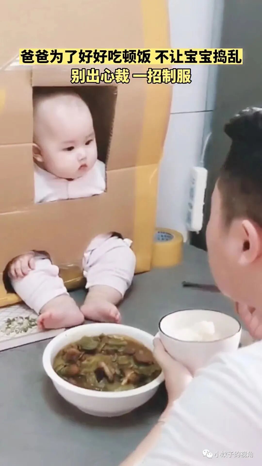 可能是第一次用这样的招式,孩子觉得非常新奇,一边盯着爸爸吃饭,一边好奇地打量着身上的纸箱子,不哭也不闹。