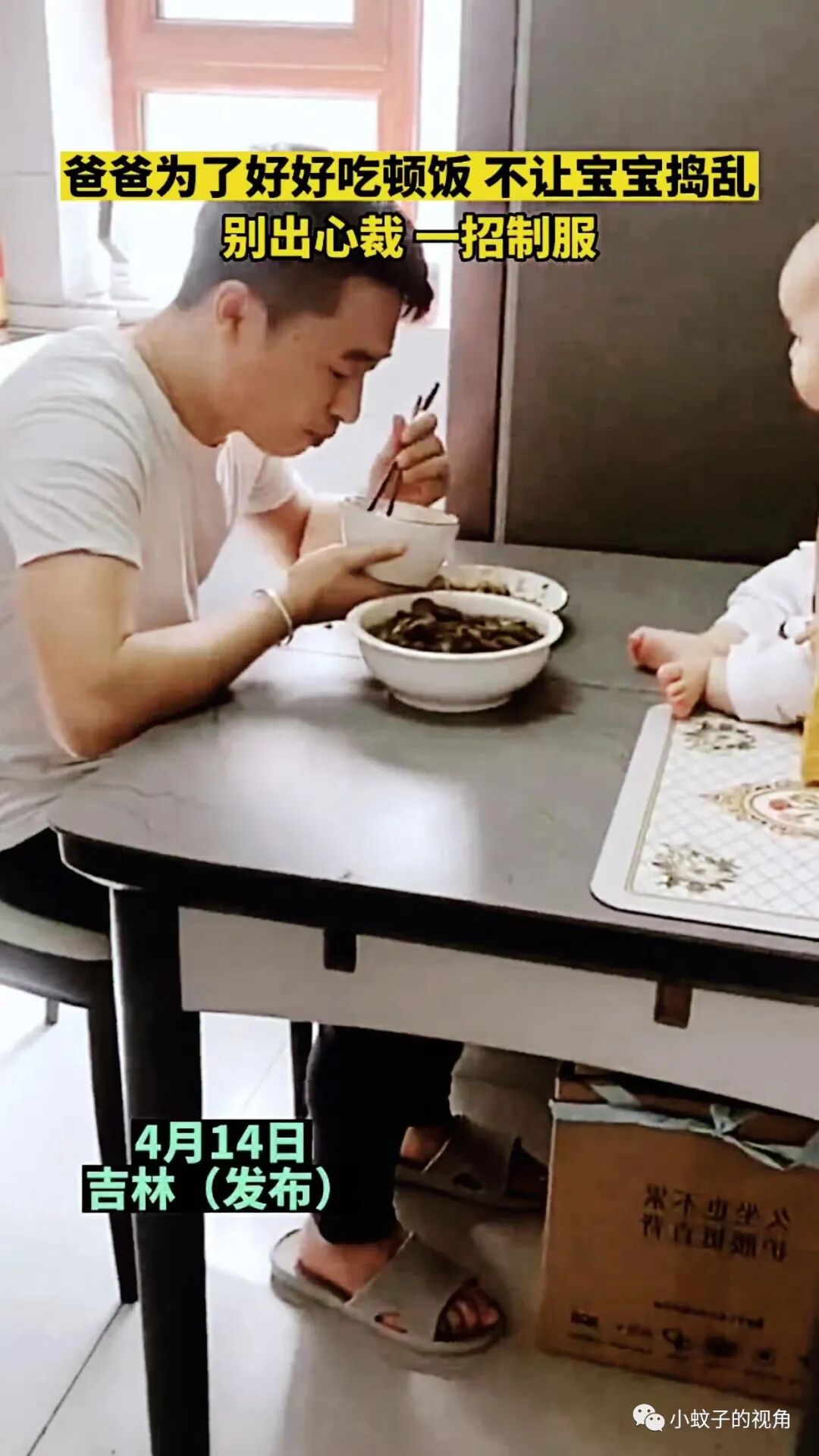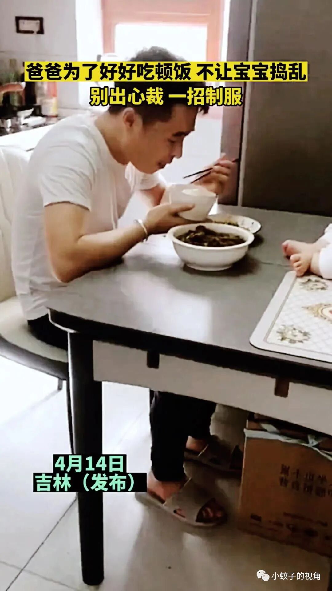这位奶爸为了吃顿安稳饭,不得不开动脑筋出奇招,看了令人直呼:脑洞真大!如果孩子奶奶看到,他肯定要挨揍!