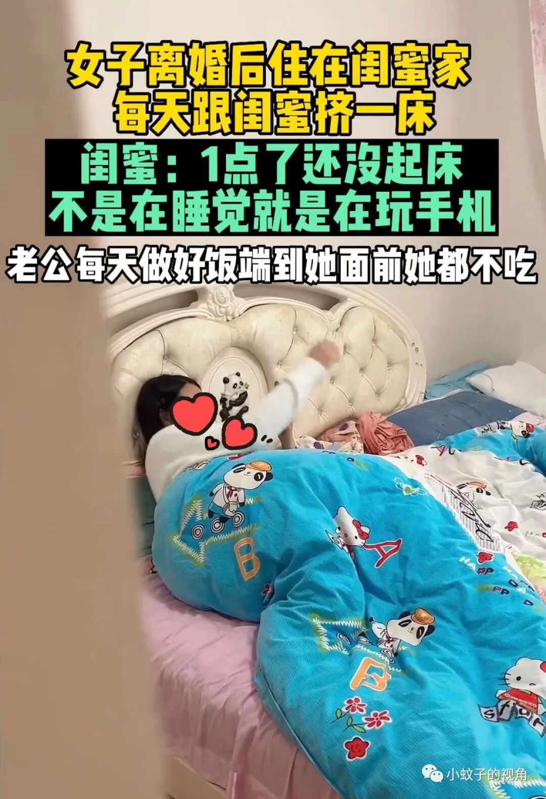 就像这位女子一样,离婚后就住在闺蜜家,跟闺蜜挤在一张床上休息,每天睡到中午还不肯起床。