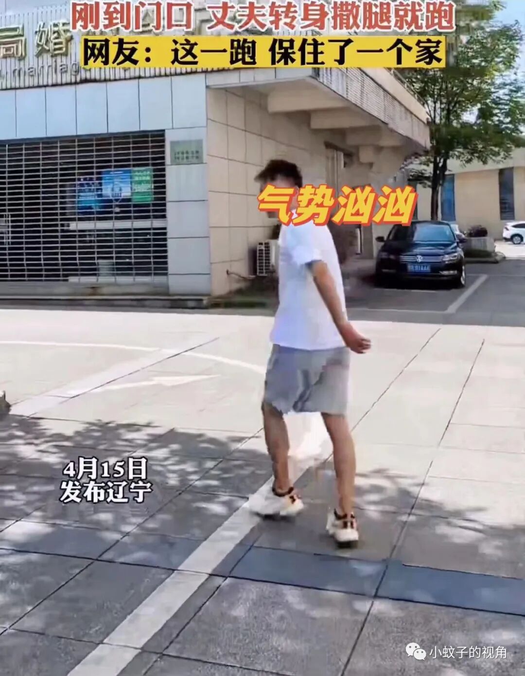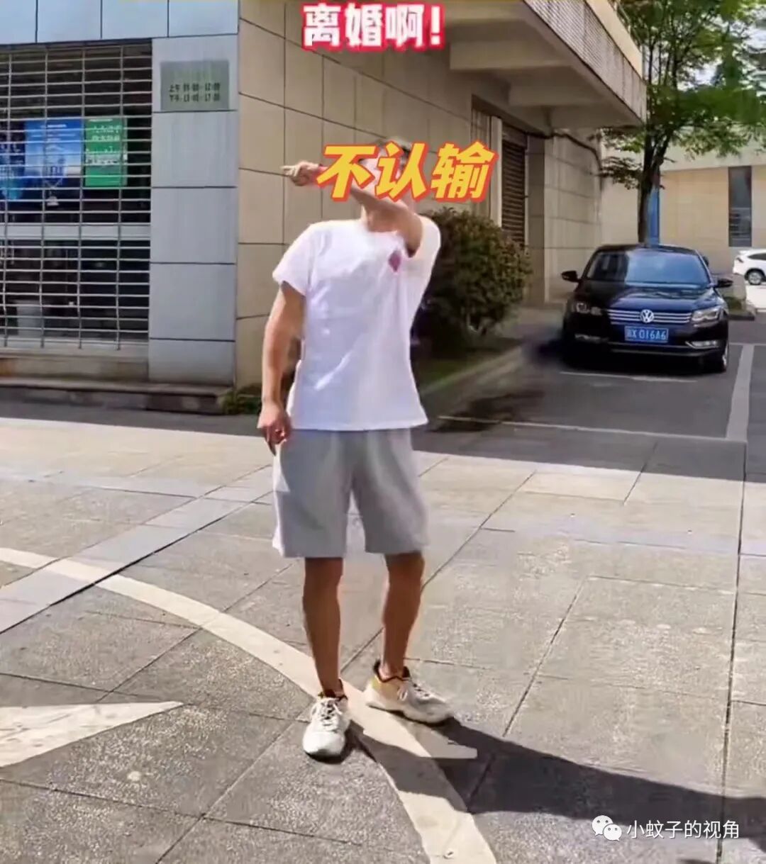 就像这对夫妻一样,夫妻吵架后去离婚。刚到民政局门口,男子气势汹汹地对着妻子比划一下,然后撒腿就跑。