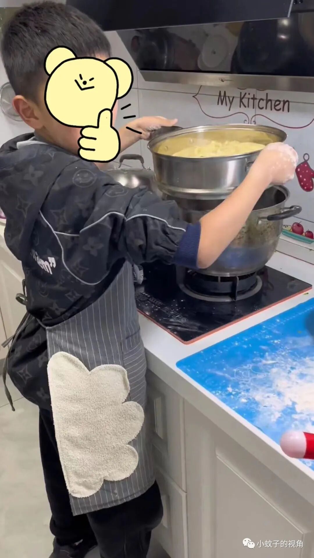 这名男孩却是个例外,他不仅会做饭,还愿意下厨帮爸爸妈妈做好吃的。