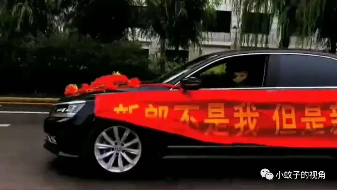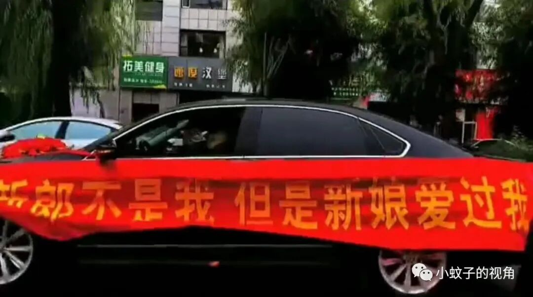 但是这位男子却不是迎亲车队中的一员,因为在他的车身上还挂着一个横幅,上面用黄色的大字赫然写着:新郎不是我,但是新娘爱过我。