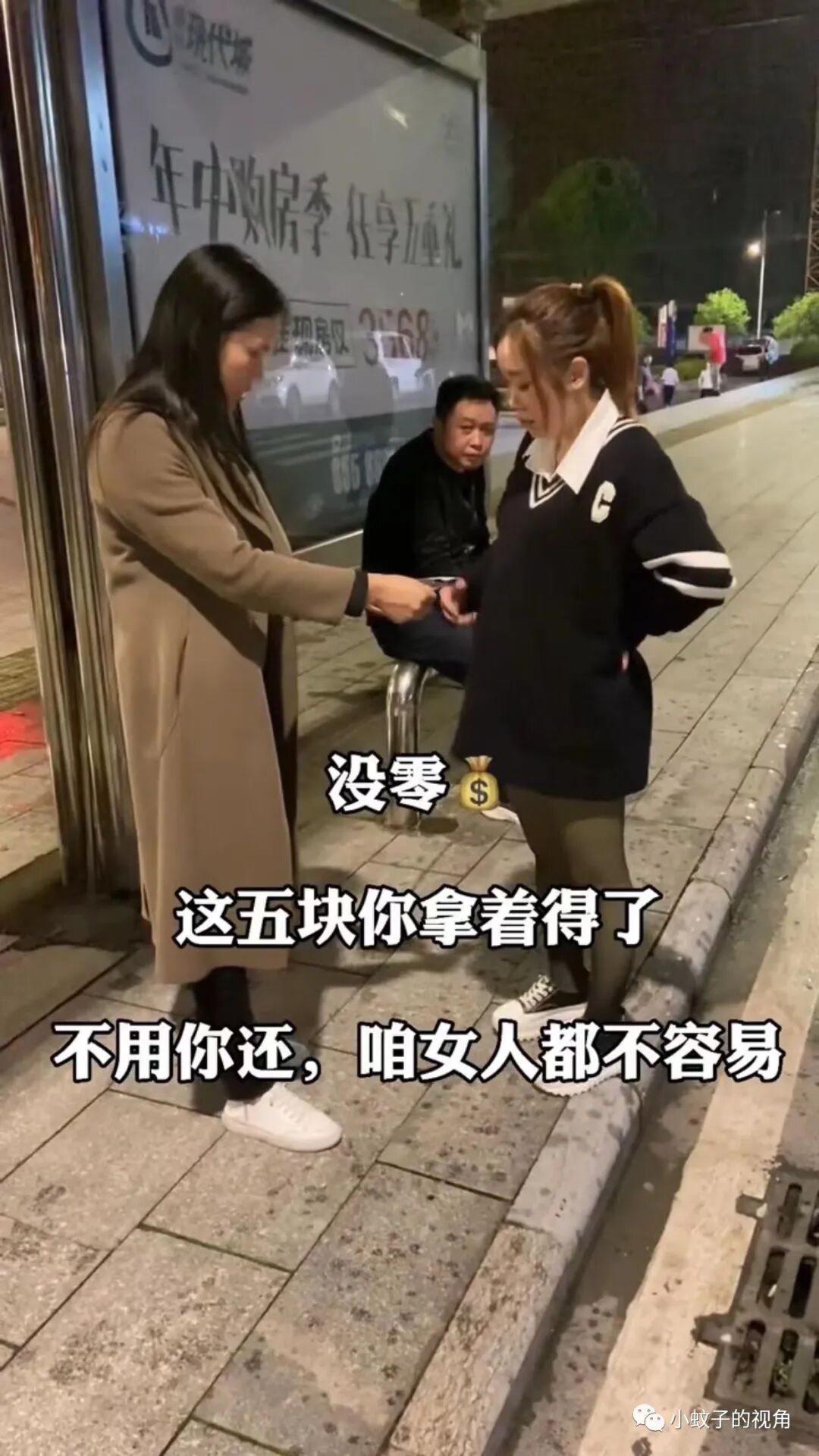 女子看了看周边,只好接下了这5块钱,并且对女子表示感谢。公交车来了,她拿着这5块钱坐上了回家的公交车。