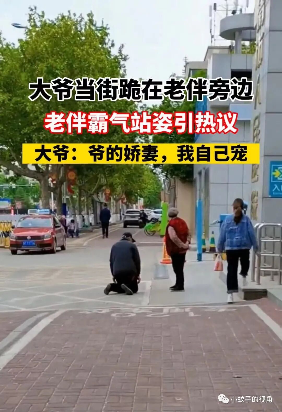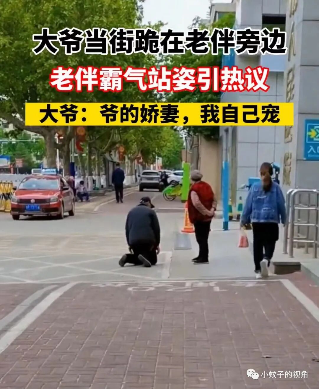 就像这位大爷一样,当街跪在老伴身旁,老伴霸气的站姿引争议:这不是爱情。