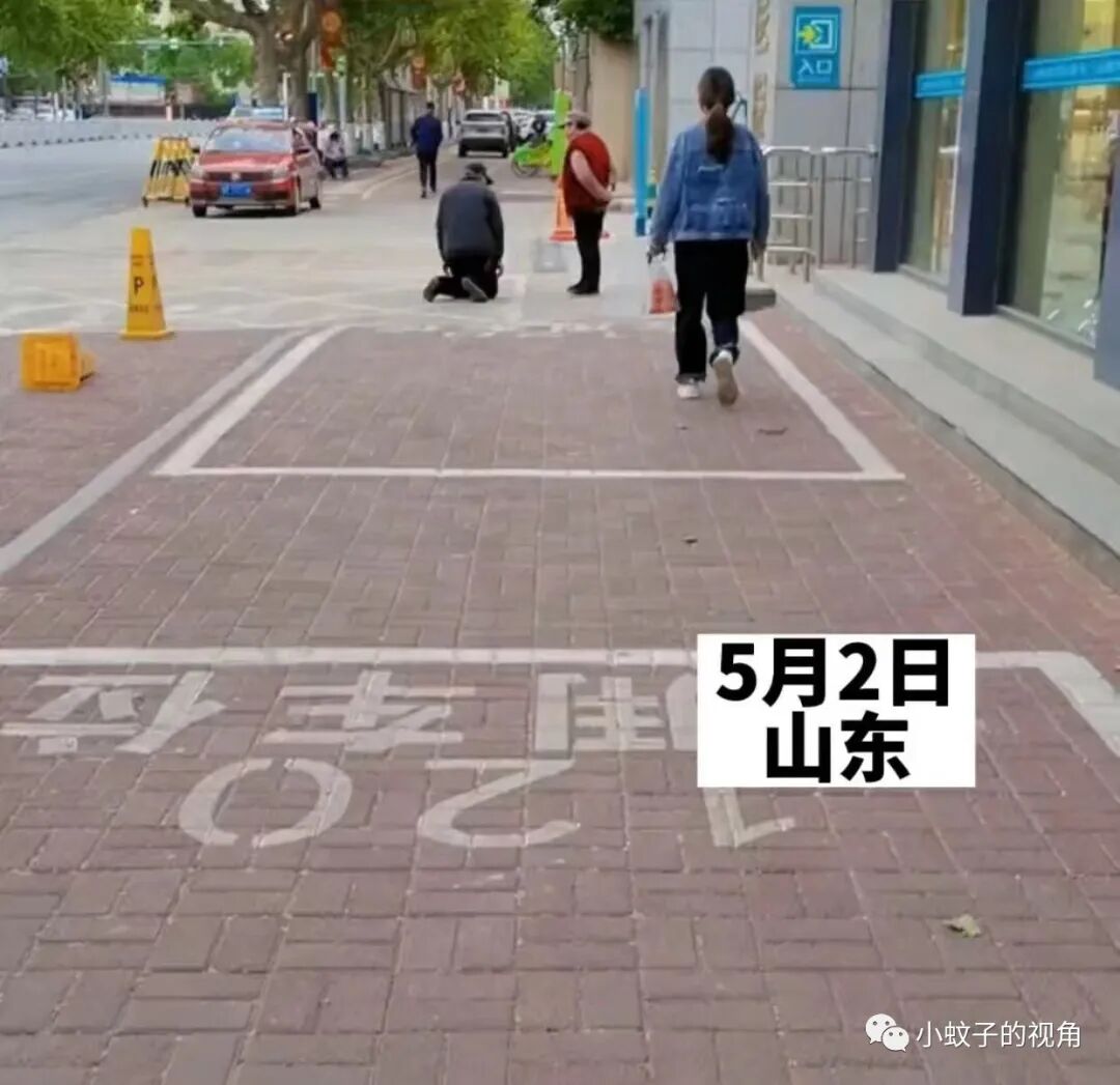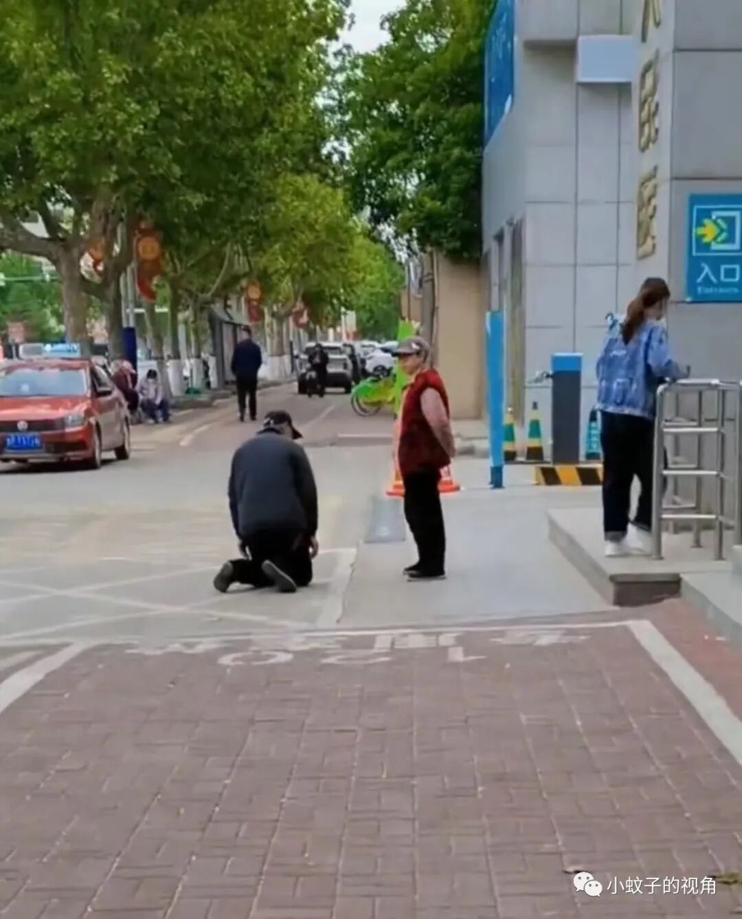 突然,大爷就跪在了大妈身旁,完全不顾大街上来来往往的人群,也不顾路人看向他们的异样目光。