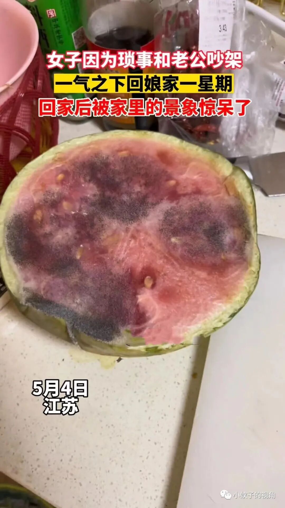 她走的时候家里还有半个西瓜,没想到等她回来的时候西瓜还在那里,只是已经长满了黑毛。