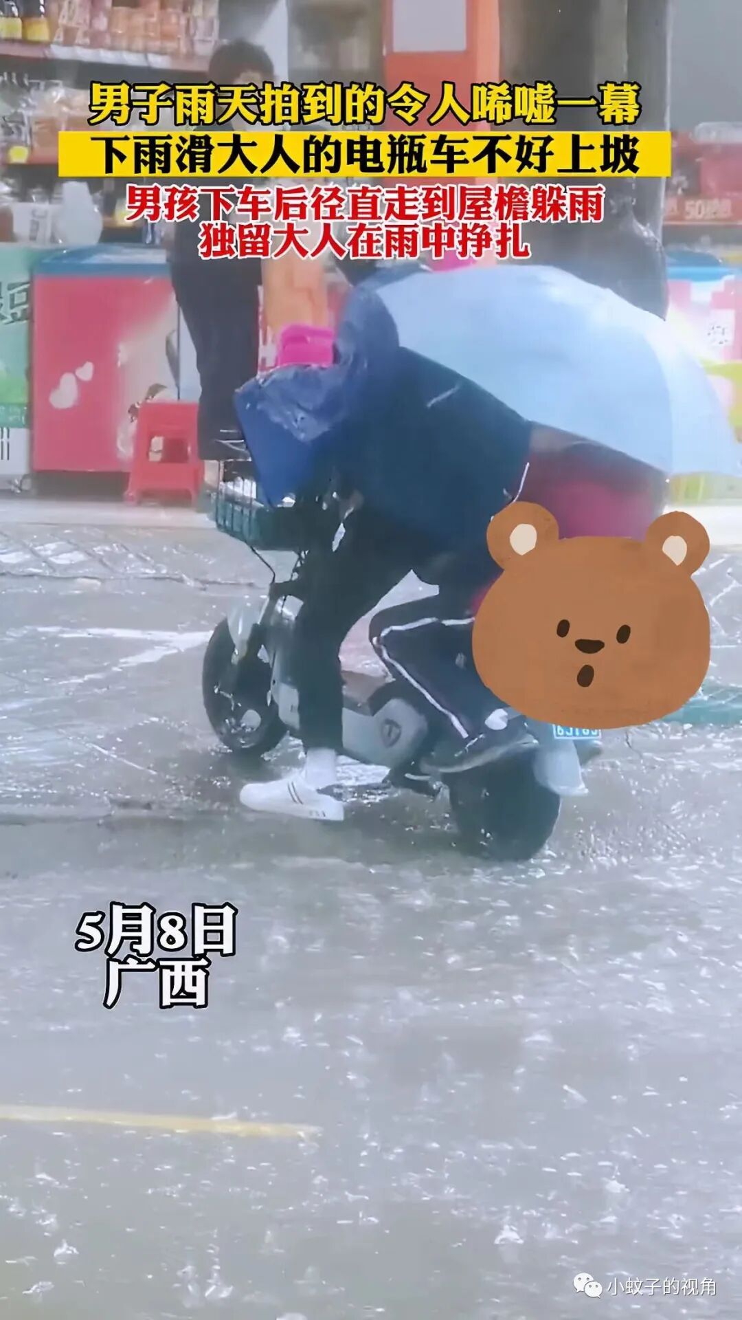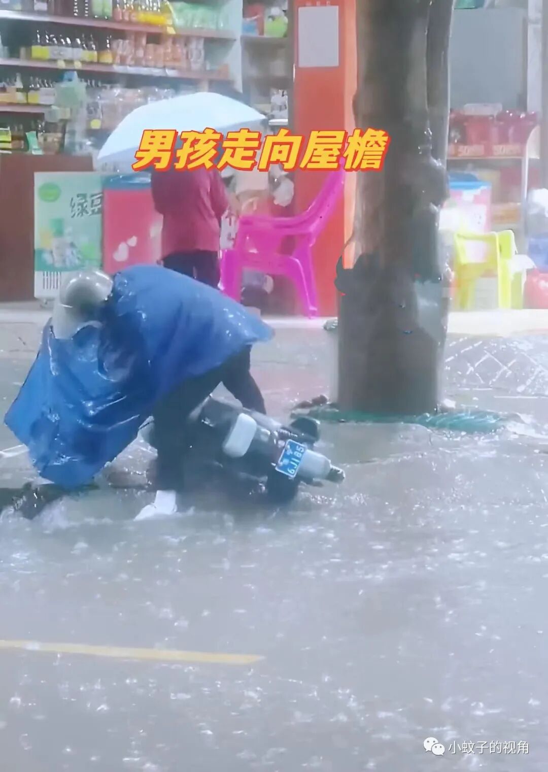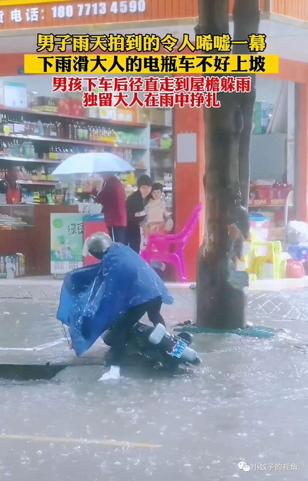 就连电瓶车眼看着就要倒在雨中时,男孩都没想到自己可以帮忙。