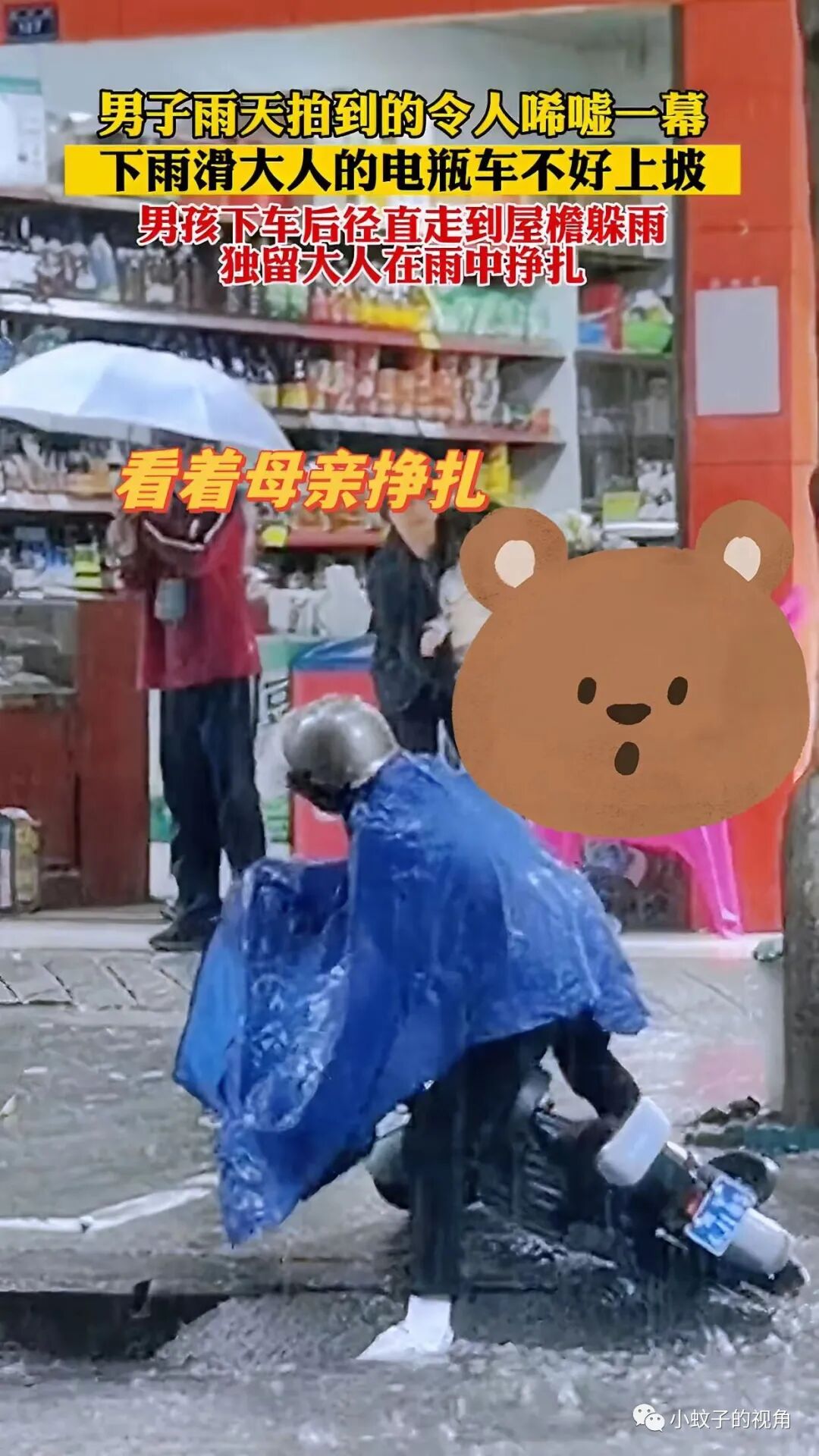 但是,这名男孩并没有伸手帮一把,而是独自去了前面的屋檐下,打着雨伞看母亲在雨中挣扎。