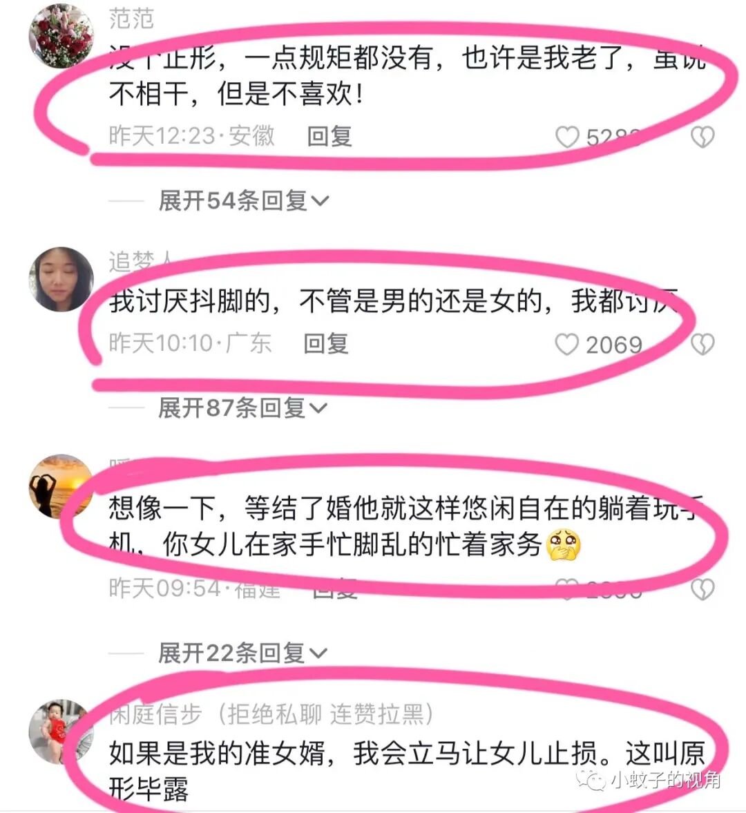 网友说:可能是我年龄大了,这样坐没坐相,站没站相的男人我看不上。别管怎么样,这还没结婚呢,在老丈人面前就这样吗?没家教!