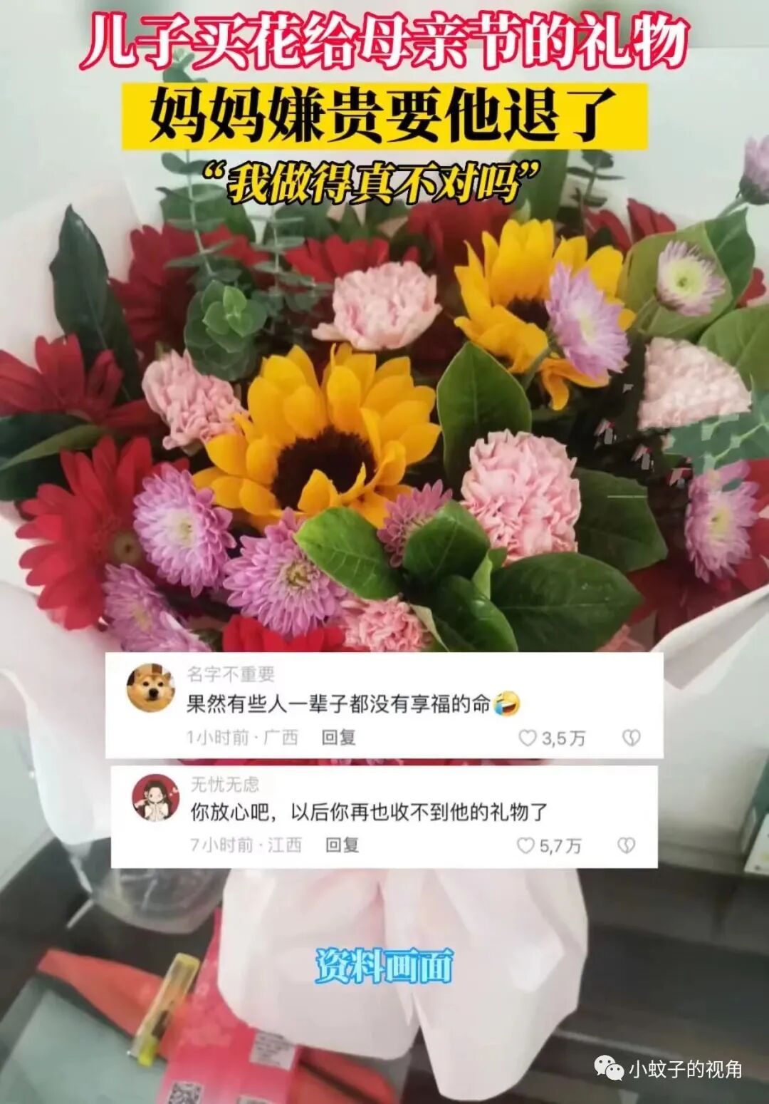 就像这位妈妈一样,母亲节那天,儿子偷偷给妈妈买了一束花,想要给妈妈一个惊喜,却没想到因此被妈妈骂哭。
