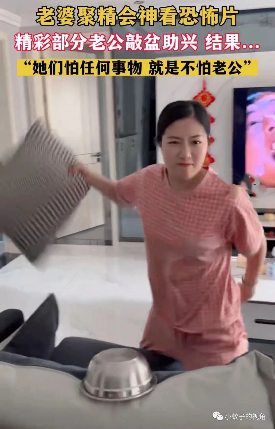 还有网友调侃说:她们女人什么都怕,就是不怕自己老公。看个恐怖片都不敢,对自己老公那是真敢下手啊!