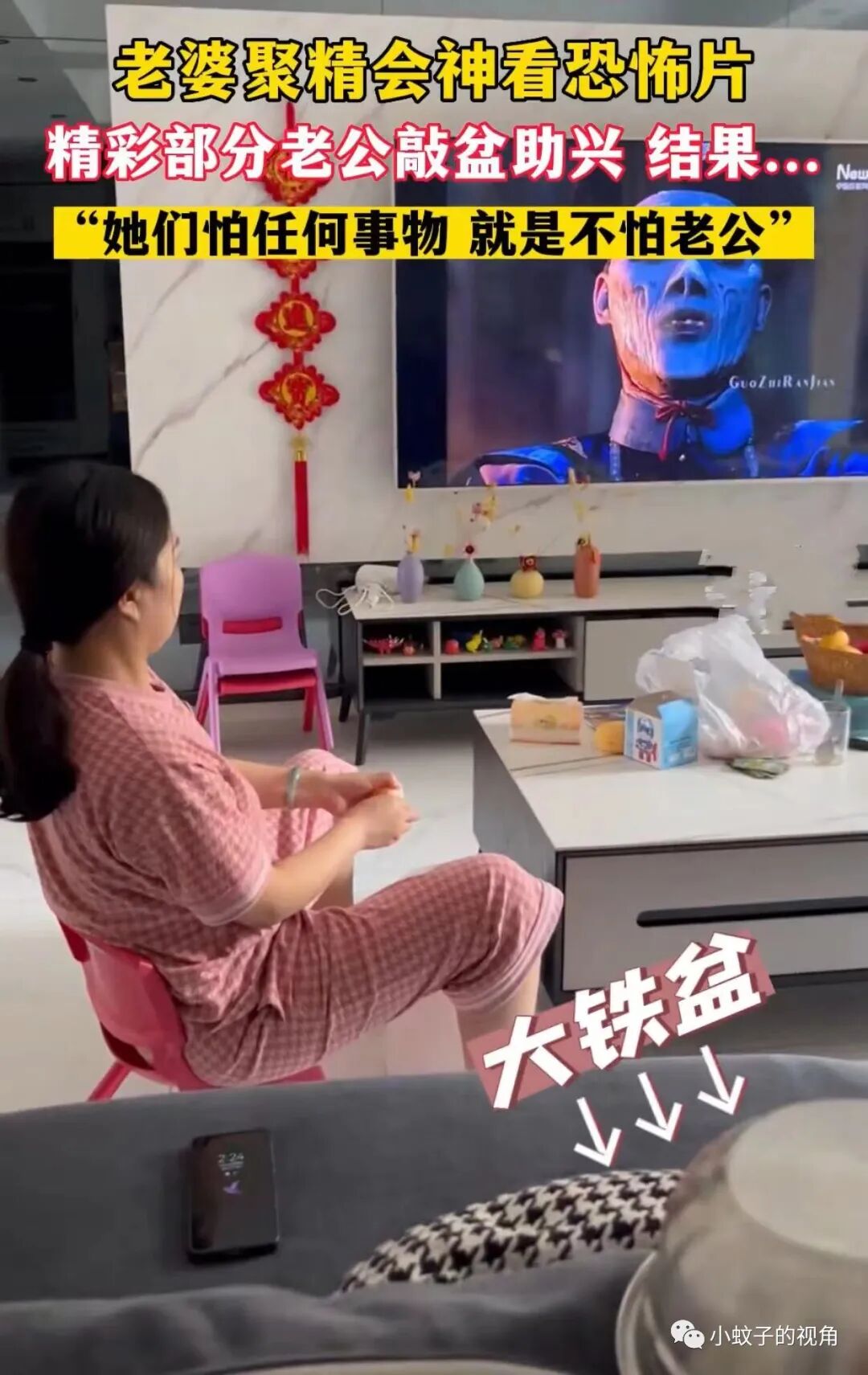 就像这对夫妻,妻子专心看恐怖片,没想到等她看到精彩部分时,老公在身后敲盆助兴,结果惨了。