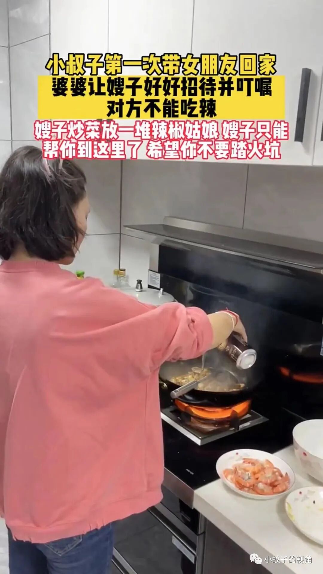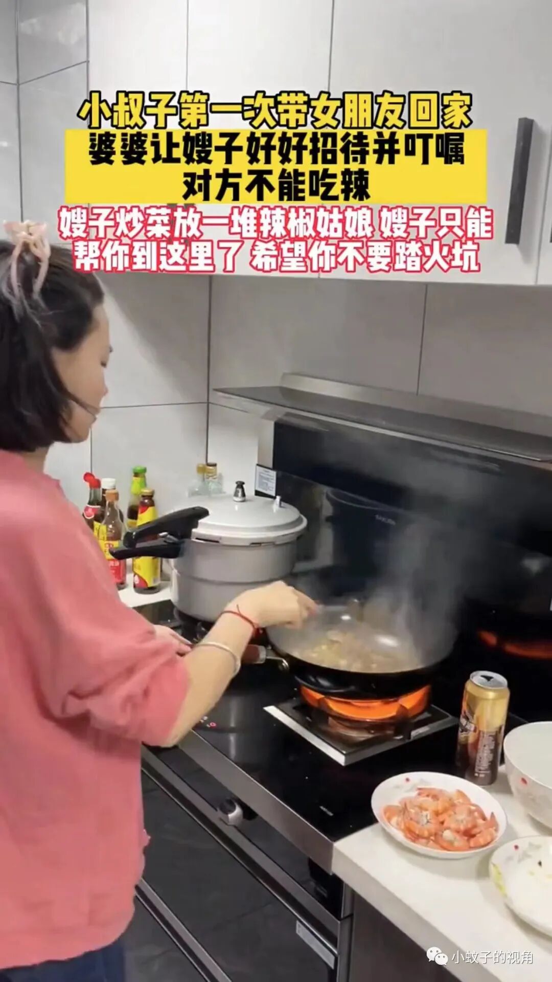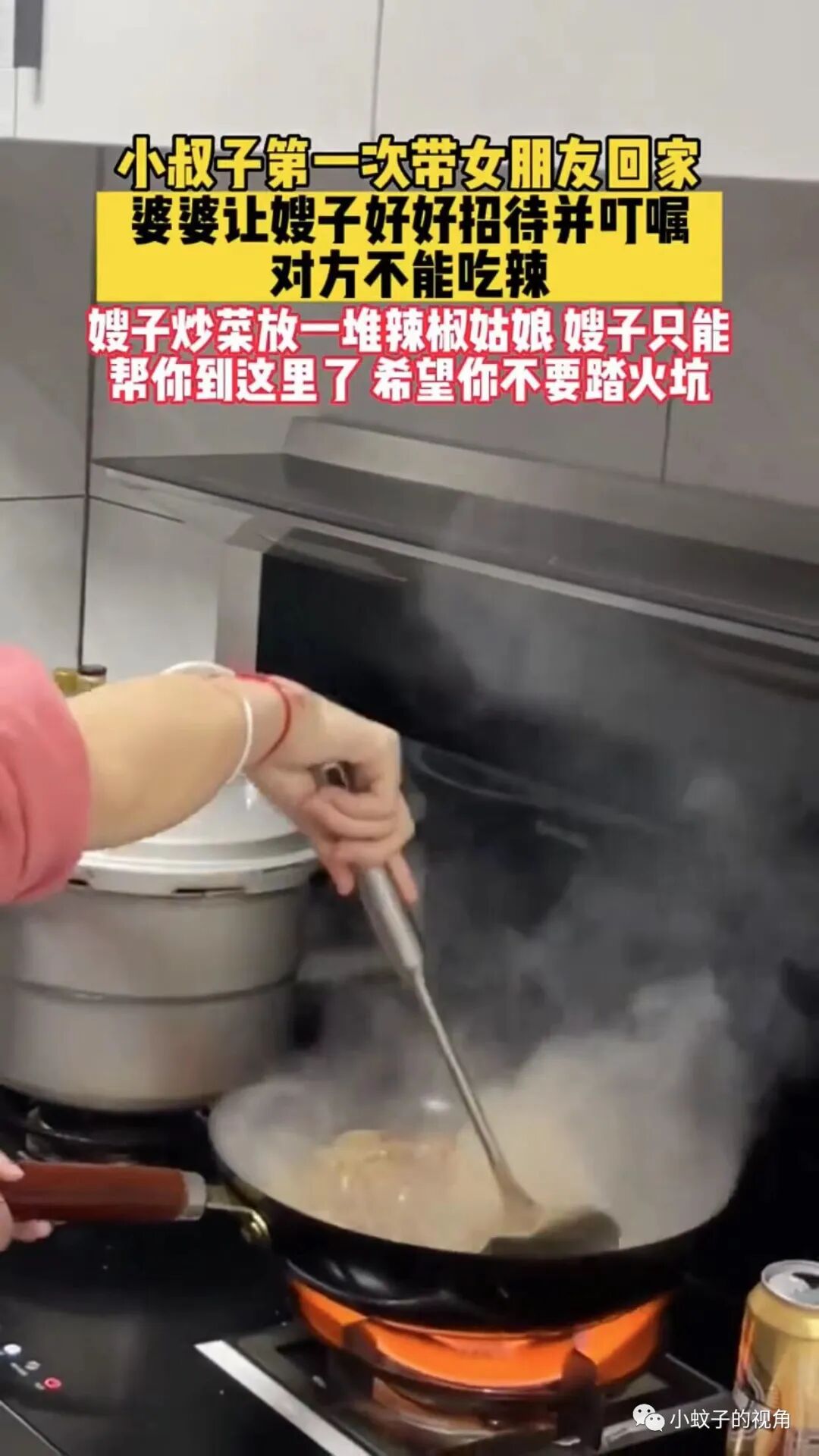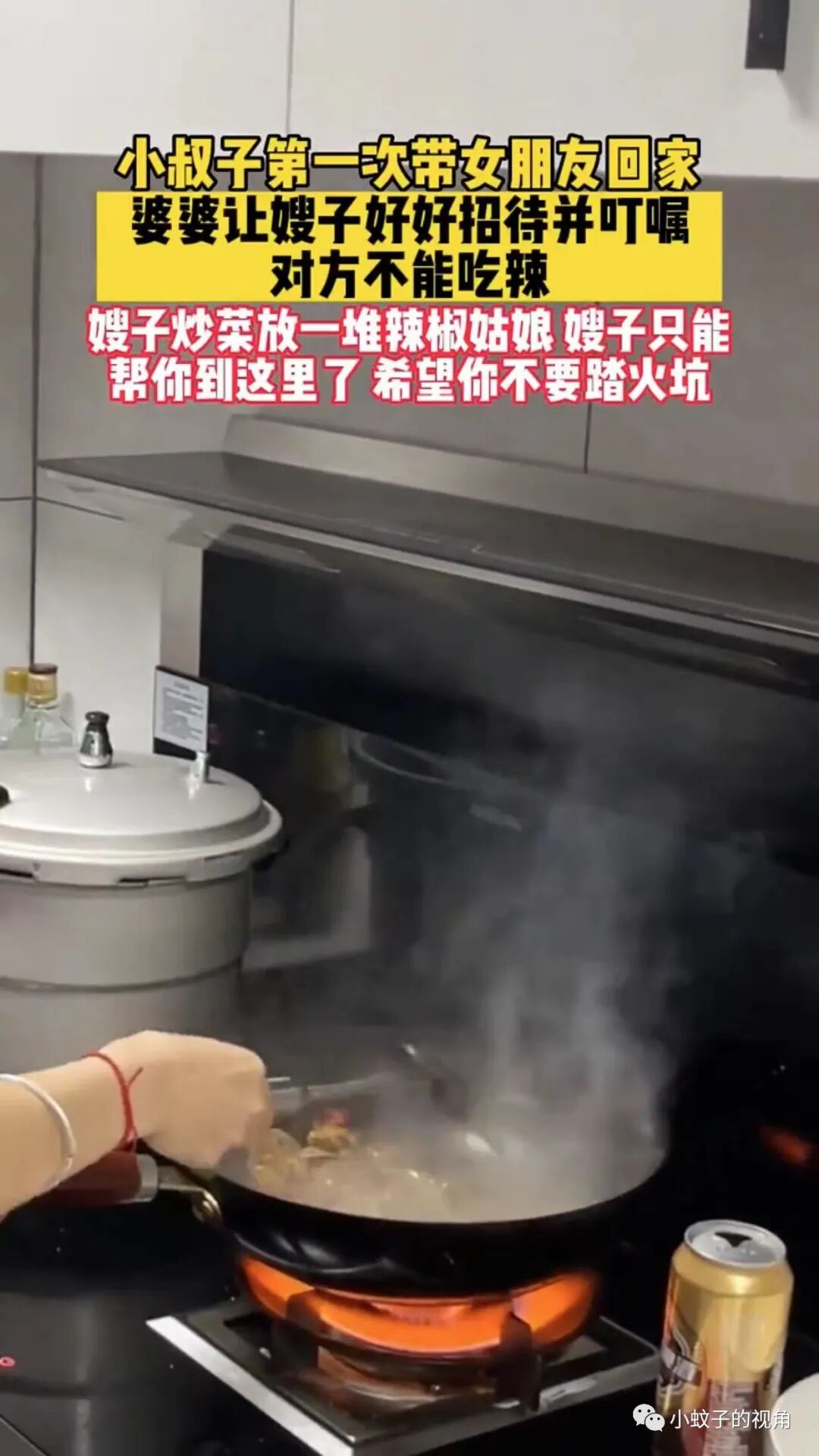 这名女子却不是如此。小叔子第一次带女朋友回家,婆婆告诉她要好好招待,并且说这个女孩不能吃辣,女子却在炒菜的时候放了很多辣椒!