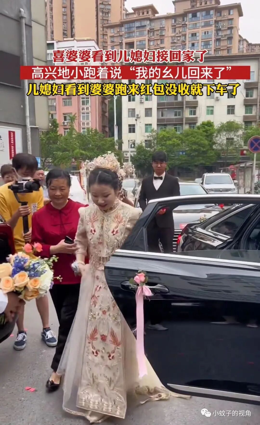 这一路小跑出来迎接儿媳,坐在车里的儿媳也看到了,就连准备好的下车礼都没收,赶紧下车向前跑去,打算迎接小跑而来的婆婆。