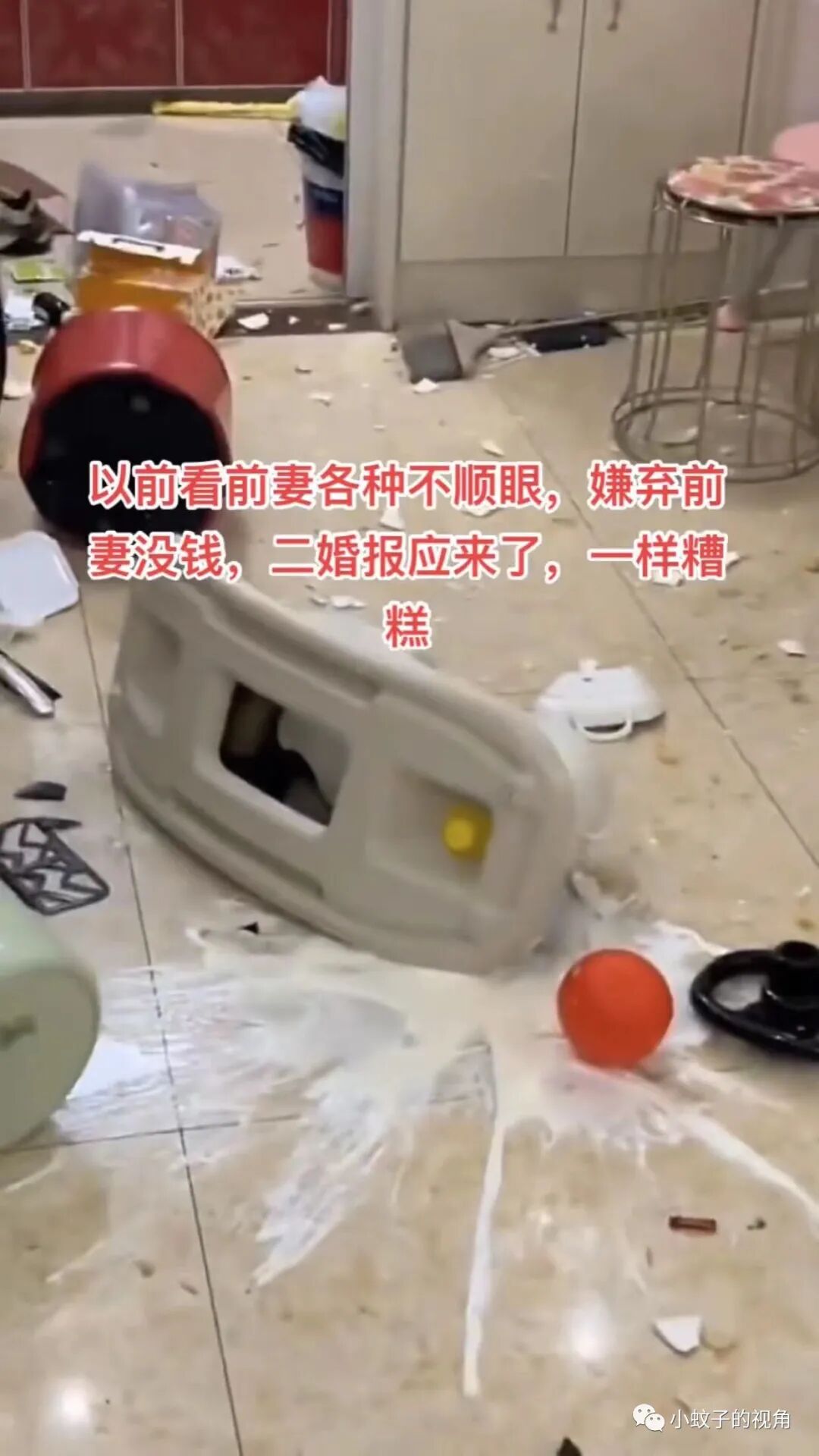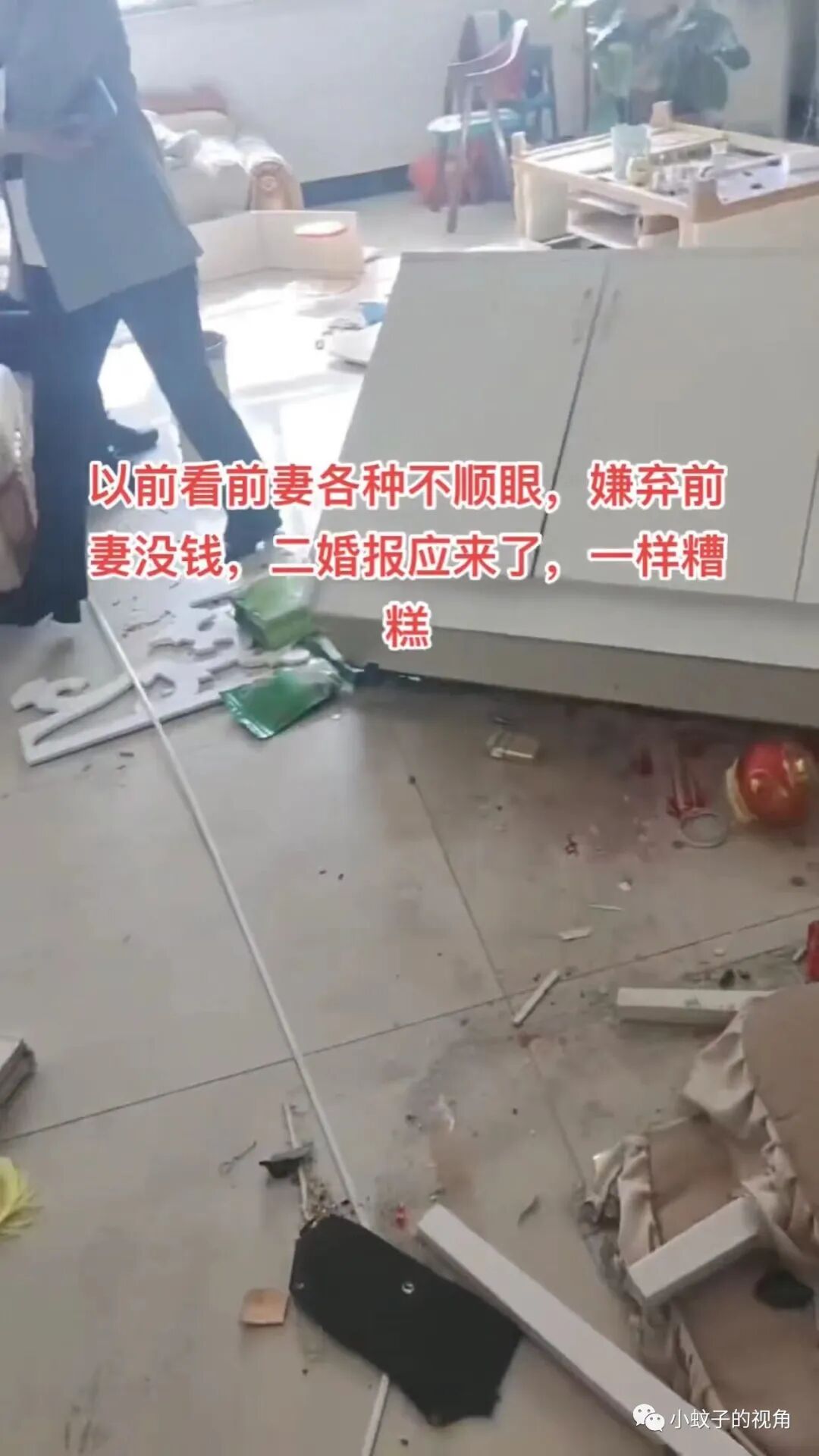 而这位妻子却把家里的东西都摔了,甚至连柜子都被掀翻在地。