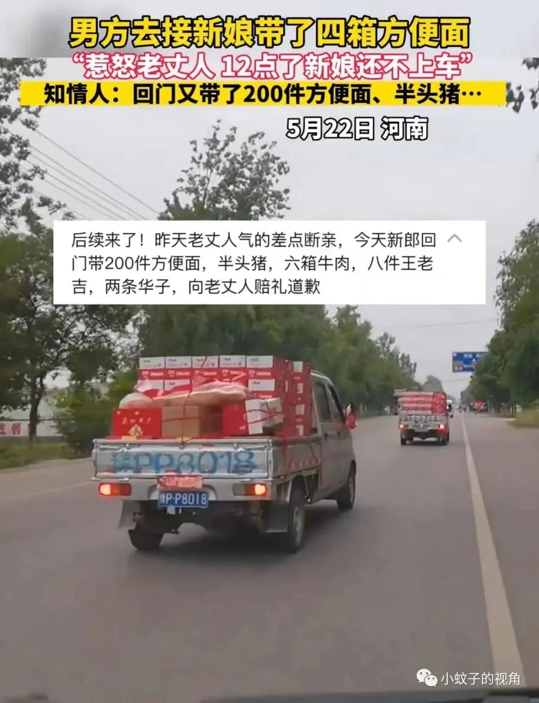 据知情者表示,昨天把老丈人气得差点段亲,今天新郎回门时带了200箱方便面,半头猪,六箱牛肉,八件王老吉和两条华子,用来向老丈人赔礼道歉。