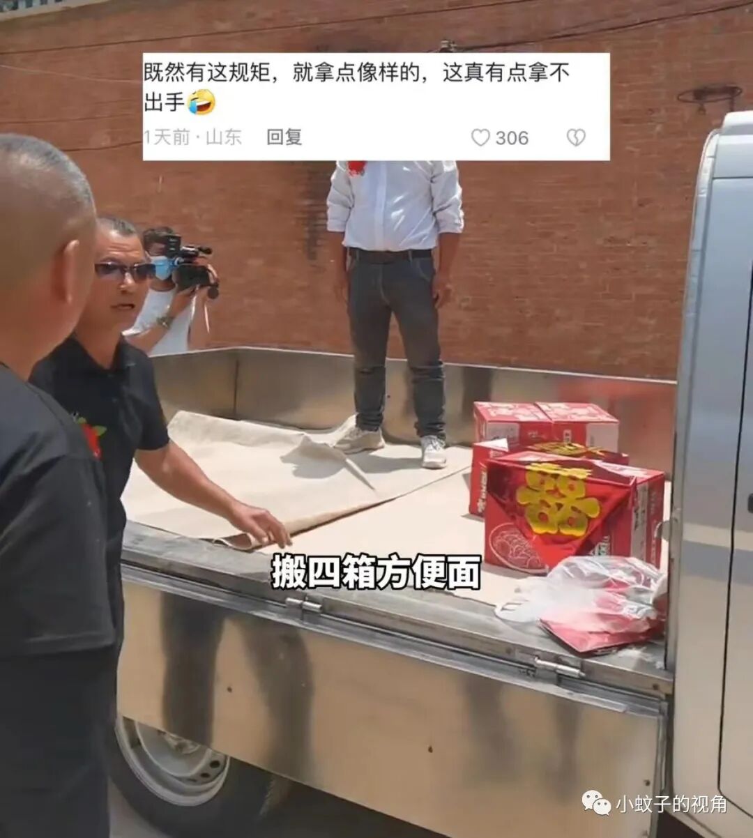 先不说这样的风俗是否合理,单单说结亲带四箱方便面这件事,新郎一家做得的确不够光彩。