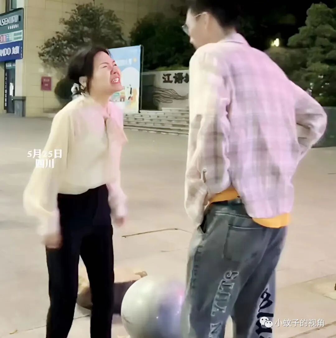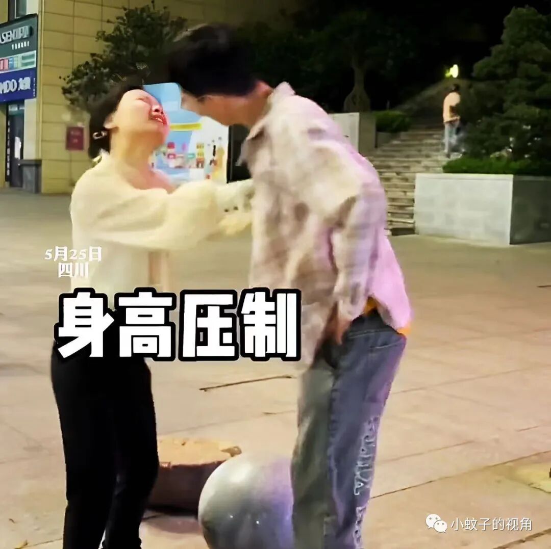 女子怒了,当男朋友再次使用身高压制时,她毫不犹豫地站在旁边的路障上,张牙舞爪地对男朋友发起进攻。